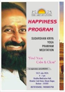 बदायूँ। आर्ट ऑफ लिविंग संस्था द्वारा 4 दिवसीय योग एवम स्वस्थ प्रशिक्षण कार्यक्रम हैप्पिनेस प्रोग्राम का आयोजन बुद्धा हॉल शंकर...