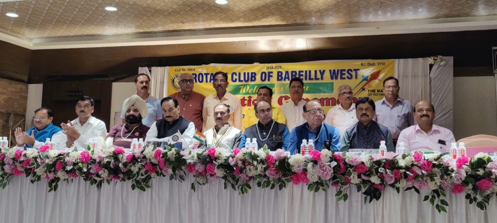 बरेली। रोटरी क्लब बरेली वेस्ट का 43वाँ अधिष्ठापन समारोह होटल द-जस ग्रान्ट में सफलतापूर्वक सम्पन्न हुआ। जिसमें मुख्य अतिथि नीरव निमेश अग्रवाल मण्डलाध्यक्ष (मण्डल 3110) रहे। मुख्य अतिथि ने पूर्व अध्यक्ष बीरज कुलश्रेष्ठ व सचिव एस० के० सक्सेना के कार्यों की सराहना करते हुये नये सत्र के अध्यक्ष मनोज मेहरोत्रा व सचिव श्याम अरोरा को कॉलर व पिन बदलवाकर अधिकारिक रूप से पदभार ग्रहण कराया और अपने शुभाशीष देते हुये नये सत्र में क्लब को नयी ऊँचाईयों तक पहुँचाने के लिए प्रेरित किया। अधिष्ठापन सामारोह में विशिष्ट अतिथि के रूप पीडीजी डा० आई. एस. तोमर (पूर्व महापौर बरेली), पीडीजी टी.पी.एस. सेठी एवं पीडीजी पी.पी. सिंह, पीडीजी डॉ० रवि मेहरा, रहे। कार्यक्रम का मंच संचालन पीएचएफ पीपी अजय शर्मा ने किया। क्लब के नये सदस्यों को मुख्य अतिथि द्वारा पिन लगवाकर सदस्य बनाकर रोटरी के सम्बन्ध में दीक्षा दी गयी। मुख्य अतिथि द्वारा क्लब की पत्रिका “रिवैली” का विमोचन किया गया। क्लब के परमानैन्ट प्रोजेक्टों की प्रशंसा की।क्लब की ओर से मुख्य अतिथि व विशिष्ट अतिथियों व मण्डल से आये अधिकारीयों को स्मृति चिन्ह भेंट किये गये। कार्यक्रम के बाद धन्यवाद प्रस्ताव पीपी जगदीश अरोरा ने दिया। मंच संचालन में पूर्ण सहयोग पीएचएफ पीपी गुरू मेहरोत्रा, पीएचएफ पीपी राज गोपाल खट्टर, पीपी विवेक मेहरा, दीपक गोयल, पीएचएफ पीपी राकेश मेहरोत्रा, पीएचएफ पीपी संजीच मनचंदा, संजय गुप्ता आदि ने सहयोग दिया। इसके साथ ही सभा समाप्ति की घोषणा की गयी।