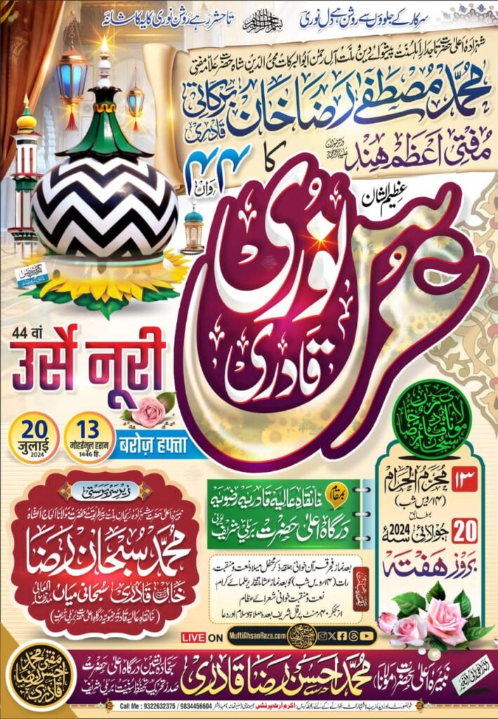 बरेली।आला हज़रत फ़ाज़िले बरेलवी के छोटे साहिबजादे मुफ्ती-ए-आज़म हिंद हज़रत मौलाना मुस्तफा रज़ा खान रहमतुल्लाह का 44 वॉ एक रोज़ा उर्स-ए-नूरी 20 जुलाई बरोज़(हफ्ता) को दरगाह परिसर में मनाया जाएगा। उर्स की शुरुआत बाद नमाज़-ए-फ़ज़्र कुरानख्वानी से होगी। दिन में नात ओ मनकबत का दौर जारी रहेगा। सभी प्रोग्राम दरगाह प्रमुख हज़रत मौलाना सुब्हान रज़ा खान(सुब्हानी मियां) की सरपरस्ती व सज्जादानशीन मुफ़्ती अहसन रज़ा क़ादरी (अहसन मियां) सदारत व सय्यद आसिफ मियां की देखरेख में संपन्न होगें। उलेमा शहीद- ए-कर्बला को खिराज पेश करने के बाद मुफ्ती आज़म हिंद की ज़िंदगी व किरदार पर रौशनी डालेंगे। मीडिया प्रभारी नासिर कुरैशी ने बताया कि मुख्य कार्यक्रम बाद नमाज़- ए-ईशा होगा। कुल शरीफ की रस्म देर रात 1 बजकर 40 मिनट पर अदा की जाएगी। सज्जादानशीन मुफ्ती अहसन मियां की खुसूसी दुआ होगी। दरगाह के वरिष्ठ मुफ़्ती सलीम नूरी बरेलवी ने बताया कि इस उर्स में शिरकत के लिए देश-विदेश से अक़ीदतमंद दरगाह शिरकत करने पहुँच रहे है। उर्स की तैयारियों को लेकर आज दरगाह पर दरगाह प्रमुख की सरपरस्ती में बैठक हुई जिसमें उर्स की लेकर चर्चा की गई। सज्जादानशीन समेत टीटीएस के शाहिद नूरी,औरंगजेब नूरी,हाजी जावेद खान,नासिर कुरैशी,अजमल नूरी,परवेज़ नूरी,ताहिर अल्वी,शान रज़ा,मंजूर रज़ा,मुजाहिद बेग,आलेनबी,नईम नूरी,सुहैल रज़ा,शाद रज़ा,साकिब रज़ा,साजिद नूरी,काशिफ सुब्हानी,इशरत नूरी,तहसीन रज़ा,सय्यद माजिद,सय्यद एजाज़ आदि लोग मौजूद रहे।
