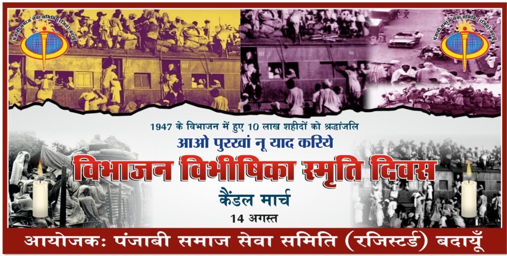 बदायूँ। पंजाबी महासमिति उत्तर प्रदेश के संयोजक प्रवीण सेठी के आवाहन पर आज पंजाबी समाज सेवा समिति कार्यकारिणी की बैठक समिति अध्यक्ष अशोक नारंग की अध्यक्षता में उनके निवास पर संपन्न हुई। जिसमें सर्वसम्मति से निर्णय लिया गया कि 1947 में विभाजन के समय हुए 10 लाख शहीदों को श्रद्धांजलि देने हेतु “विभाजन विभीषिका स्मृति दिवस”का कार्यक्रम तय हुआ। उक्त संदर्भ में एक कैंडल मार्च 14 अगस्त को शाम 6:30 बजे निकट सत्संग भवन निकट बिरुआ बाड़ी मंदिर से पंजाबी मंदिर के लिए प्रस्थान करेगी। तत्पश्चात पंजाबी मंदिर में कैंडल स्थापित कर उन 10 लाख शहीदों को 1 मिनट का मौन रखकर श्रद्धांजलि अर्पित की जाएगी| समिति द्वारा सर्व पंजाबी समाज से अपील की गई है कि उक्त प्रोग्राम में अपनी उपस्थिति दर्ज कर विभाजन के समय हुए उन शहीदों को श्रद्धांजलि अर्पित करने जरूर पहुंचे| आपको बता दे सरकार अब यह दिवस मना रही है। जबकि पंजाबी सेवा समिति आठ दस सालों से यह दिवस मना रही है।