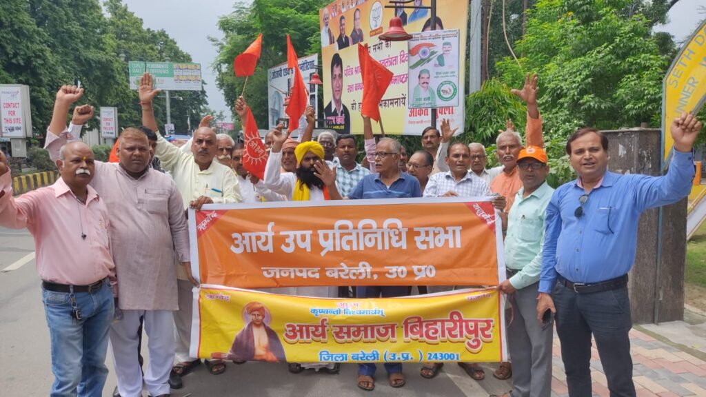 बरेली। बांग्लादेश में सनातनी समुदाय की सुरक्षा एवं संरक्षण की मांग करते हुए आर्य उप प्रतिनिधि सभा के प्रधान ओमकार आर्य के नेतृत्व में प्रधानमंत्री को संबोधित जिला अधिकारी कार्यालय में सिटी मजिस्ट्रेट को ज्ञापन दिया। ओमकार आर्य ने कहा बांग्लादेश में हिंसा लूट आगजनी बलात्कार जैसी हृदय विदारक घटनाएं घटित हो रही है । यह 1947 के बटवारे के पश्चात पाकिस्तान में हिन्दुओं के साथ हुई बर्बरता के समान ही दिखाई दे रहा है इसे रोकना आवश्यक हैं। हम मांग करते है कि बांग्लादेश के हिन्दुओं की सुरक्षा शीघ्र हो। प्रयासों के साथ ही उनको भारत में संरक्षण देना चाहिए। क्योंकि किसी अन्य राष्ट्र में उनको कोई शरण नहीं देगा। ज्ञापन देने बालो में महेश आर्य , आर्य गंगाराम, सुरेश चंद , राजीव आर्य , शिवम आर्य , ओम सिंह , नुक्ता प्रसाद , ओमवीर आदि मोजूद रहे।
