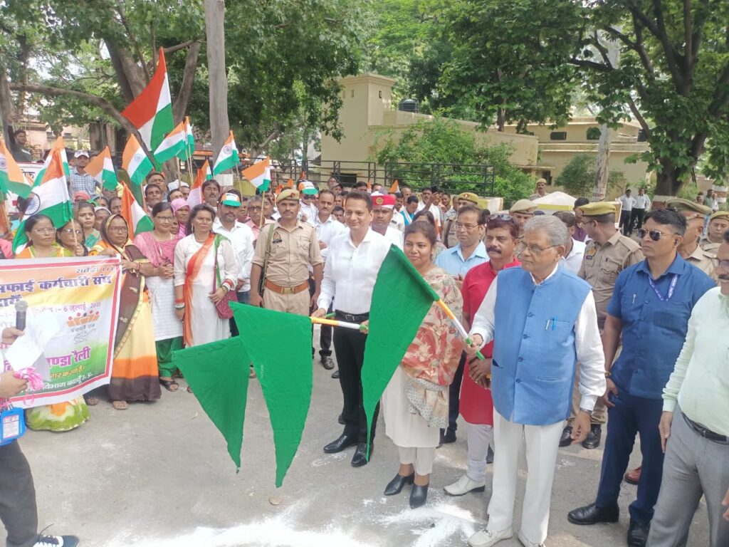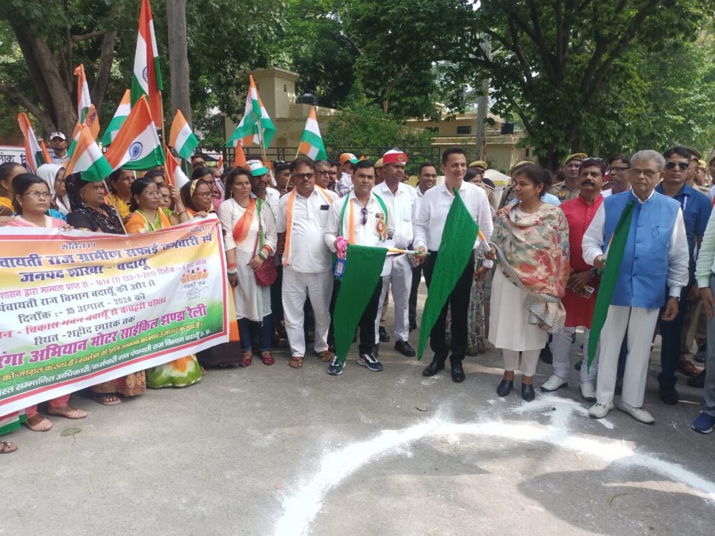 बदायूँ। प्रदेश सरकार में राज्यमंत्री स्वतंत्र प्रभार अरुण कुमार सक्सेना व जिलाधिकारी निधि श्रीवास्तव ने पीडब्ल्यूडी गेस्ट हाउस से पंचायती राज विभाग के सफाई कर्मचारियों द्वारा हर घर तिरंगा अभियान अंतर्गत निकली गई मोटरसाइकिल झंडा रैली को हरी झंडी दिखाकर रवाना किया।