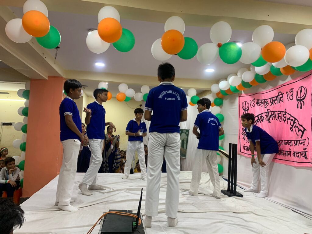 बदायूँ। पंजाबी चौक स्थित श्री गुरु नानक जूनियर हाई स्कूल के प्रांगण में 78 व स्वतंत्रता दिवस बड़ी धूमधाम से मनाया गया । सर्वप्रथम विद्यालय की अध्यक्ष रजनी अनेजा ने ध्वजारोहण किया और सरस्वती मां के समक्ष दीप प्रज्वलित किया । इसके उपरांत बच्चों ने नारे लगाए व राष्ट्रगान गाया । कार्यक्रम का शुभारंभ सरस्वती वंदना एवं गणेश वंदना से किया गया। कक्षा UKG के नन्हे मुन्ने बच्चों ने WELCOME SONG प्रस्तुत कर आए हुए अतिथियों का स्वागत किया। प्रधानाचार्या ने मुख्य अतिथि रजनी अनेजा को बुके देकर उनका स्वागत किया। कक्षा I and II के बच्चों ने I LOVE MY INDIA और SUNO GAUR SE DUNIYA WALO पर डांस प्रस्तुत कर सबका मन मोह लिया। कक्षा VIII की पावनी और लाव्यांश ने स्वतंत्रता दिवस पर अपने विचार व्यक्त किए। इसके उपरांत कक्षा III व V के छात्र-छात्राओं ने RANG DE BASANTI