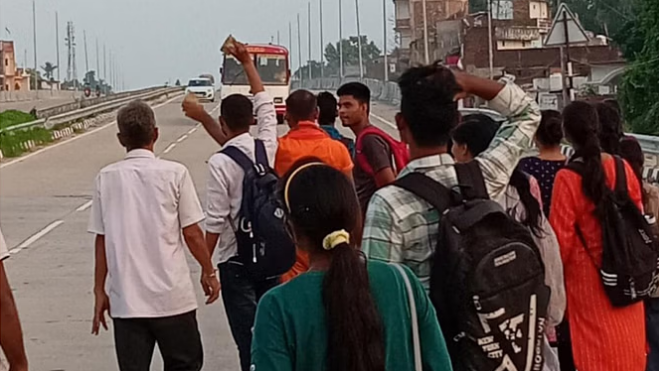 गोरखपुर। क्षेत्र के रघुराज सिंह किसान इंटर कॉलेज से शनिवार को द्वितीय पाली की सिपाही भर्ती परीक्षा देकर बाहर निकले अभ्यर्थियों ने गोरखपुर की तरफ आ रही रोडवेज बस को रोकने की कोशिश की और न रोकने पर पत्थर फेंकने शुरू कर दिए। इसमें बस की हेड लाइट का शीशा टूट गया। अभ्यर्थी हाथ देने के बाद भी बस नहीं रोकने से आक्रोशित थे। बस पर पत्थर चलाने को लेकर चालक-परिचालक और अभ्यर्थियों के बीच कहासुनी हो गई। अभ्यर्थी हंगामा करने लगे। आसपास के लोगों ने दोनों पक्षों को समझाकर मामला शांत करवाया। अभ्यर्थी उसी बस में बैठकर रवाना हुए। जानकारी के अनुसार, द्वितीय पाली की परीक्षा शाम पांच बजे छूटी थी। इसके बाद से ही अभ्यर्थी सड़क पर खड़े होकर बस रोकने का प्रयास कर रहे थे। कई बसें हाथ देने के बाद भी नहीं रूकीं। करीब एक घंटे बाद नाराज अभ्यर्थी हाथ में ईंट-पत्थर लेकर खड़े हो गए। इस दौरान गोरखपुर की तरफ आ रही गाजीपुर रोडवेज की एक बस को रोकने के लिए सड़क पर आ गए, लेकिन चालक तेजी से गाड़ी आगे बढ़ाने लगा। इसी दौरान कुछ अभ्यर्थियों ने बस पर पत्थर चला दिया, जिससे हेड लाइट का शीशा टूट गया। इसके बाद बस रोककर चालक – परिचालक ने भी नाराजगी जाहिर करनी शुरू कर दी। इसकी प्रतिक्रिया में अभ्यर्थी हंगामा करने लगे। एसपी दक्षिणी जितेंद्र कुमार ने बताया कि मामला संज्ञान में नहीं आया। शिकायत मिलेगी तो सरकारी संपत्ति को नुकसान पहुंचाने के आरोप में केस दर्ज किया जाएगा।