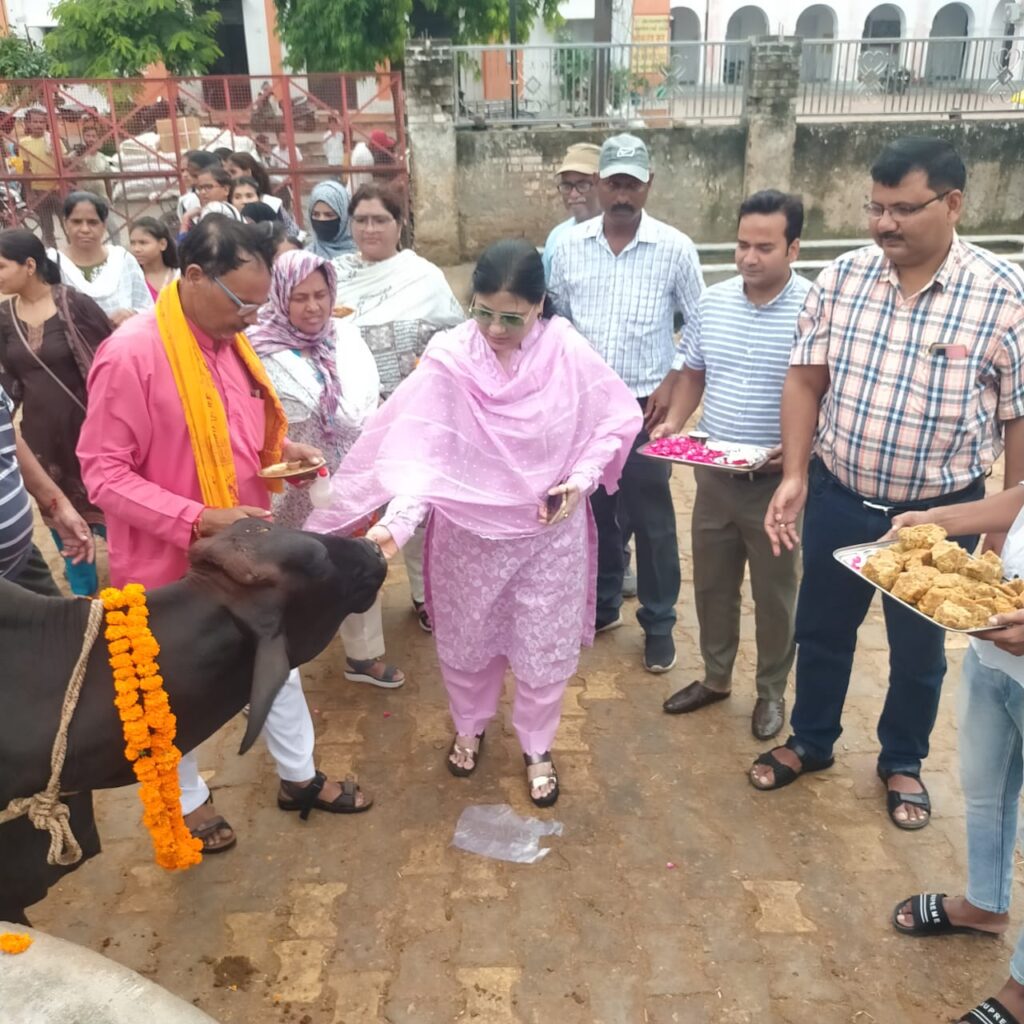 बदायूँ। आज श्री कृष्ण जन्माष्टमी के पावन पर्व पर नगर पालिका प्रांगण स्थित आस्थाई गौशाला में अध्यक्ष फात्मा रजा व नगर मजिस्ट्रेट/अधिशासी अधिकारी अरुण कुमार की उपस्थिति में गौ पूजन किया गया। गौ पूजन के दौरान सभी गौवंशों को तिलक व माला पहनाकर गुड, चोखर, हरा चारा खिलाया गया। उक्त कार्यक्रम में कक्षा-06 से 12 तक के स्कूली बच्चों को गौशाला का भ्रमण कराया गया, और गौपालन के प्रति संवेदनशील बनाते हुए श्री कृष्ण जन्माष्टमी के त्यौहार एवं गौपालन के महत्व से अवगत कराया गया। गौ-पूजन कार्यक्रम में उपस्थित गौशाला नोडल प्रभारी केशव गंगवार, कार्यालय अधीक्षक खालिद अली खॉ, गौशाला प्रभारी श्री मुशाहिद अली व अन्य कर्मचारीगण उपस्थित रहे।