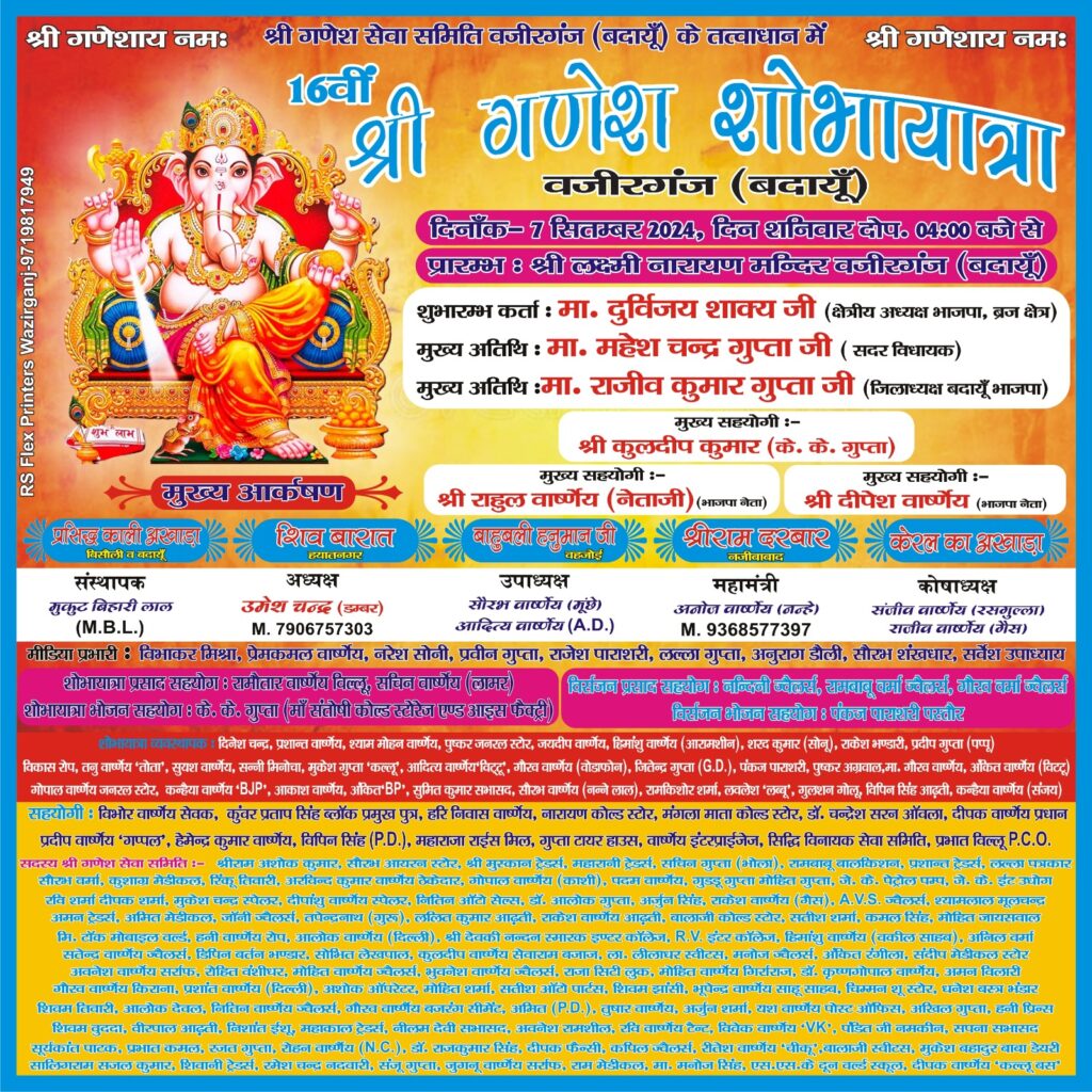 वजीरगंज। श्री गणेश सेवा समिति द्वारा आयोजित 16वीं श्री गणेश महोत्सव शनिवार से शुरू होगा। महोत्सव का आयोजन 7 सितंबर से श्री लक्ष्मी नारायण मंदिर वजीरगंज में शुरू होगा। जिसमें शिव बारात ;बाहुबली हनुमान, हयातनगर वहजोई श्रीराम दरबार नजीबाबाद काली अखाड़ा बिसौली व बदायूँ के होंगे।