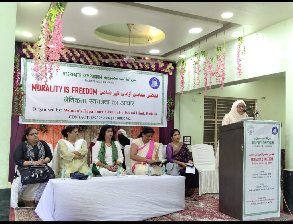 बदायूँ।”नैतिकता स्वतंत्रता का आधार है विषय पर एक अंतरधार्मिक संगोष्ठी आयोजित की गई। डॉ. आयशा खान ने कुरान की तिलावत से शुरुआत की। डॉ. राबिया शकील ने इस अभियान का परिचय कराया। JIH महिला विभाग, पश्चिम उत्तर प्रदेश की सचिव डॉ. संजीदा आलम ने कहा कि जब तक लोग पैगंबरों की शिक्षाओं पर चलते रहे, तब तक यह दुनिया शांति का स्थल बनी रही, आजादी के वर्तमान नारे ने महिलाओं को शारीरिक और मानसिक रूप से गुलाम बना दिया है।आज हम सभी का दायित्व बनता है कि हम अपने समाज में नैतिक मूल्यों को विकसित करने का प्रयास करें। शोभा फ्रांसिस ने कहा कि आज जमात-ए-इस्लामी ने नैतिक गुणों को बढ़ावा देने के लिए जो कदम उठाया है वह सराहनीय है, नैतिक पतन आज एक बड़ी समस्या है।कार्यक्रम को आगे बढ़ाते हुए श्रध्या सदावती बोध ने कहा हमें भारत के संविधान द्वारा महिलाओं को दिए गए अधिकारों को समझने का प्रयास करना चाहिए।