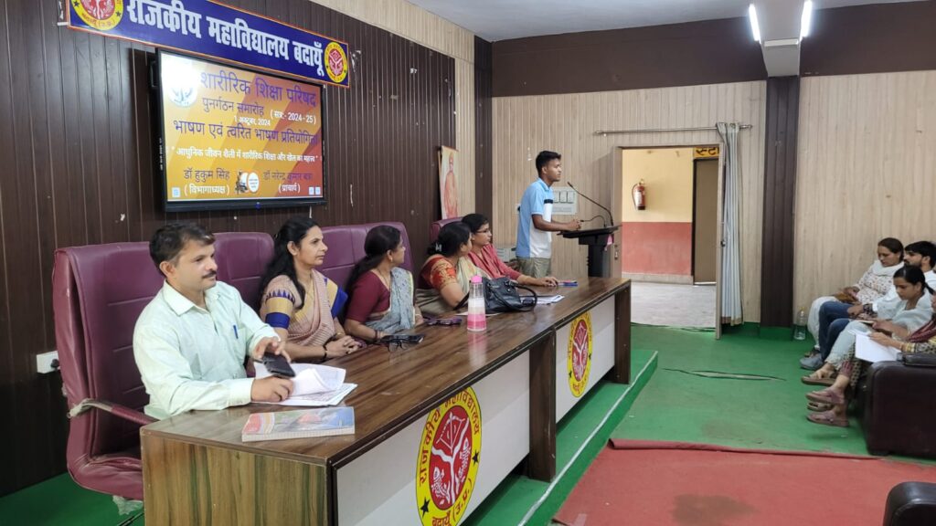 बदायूँ। राजकीय महाविद्यालय में नए सत्र के लिए शारीरिक शिक्षा परिषद का पुनर्गठन कर भाषण और त्वरित भाषण प्रतियोगिता का आयोजन किया गया। डॉ श्रद्धा गुप्ता की अध्यक्षता तथा शारीरिक शिक्षा एवं क्रीड़ा विभाग के प्रभारी डॉ हुकुम सिंह के निर्देशन में आधुनिक जीवन शैली में शारीरिक शिक्षा और खेलकूद का महत्व विषय पर सम्पन्न भाषण प्रतियोगिता में प्रथम स्थान पवन कुमार को मिला । दूसरे स्थान पर राय सिंह तथा तीसरे स्थान पर पवन प्रताप सिंह रहे। त्वरित भाषण प्रतियोगिता में पहला स्थान अजिंक्या को मिला। दूसरे स्थान पर पवन प्रताप सिंह एवं तीसरे स्थान पर सत्यम यादव को सफलता मिली।