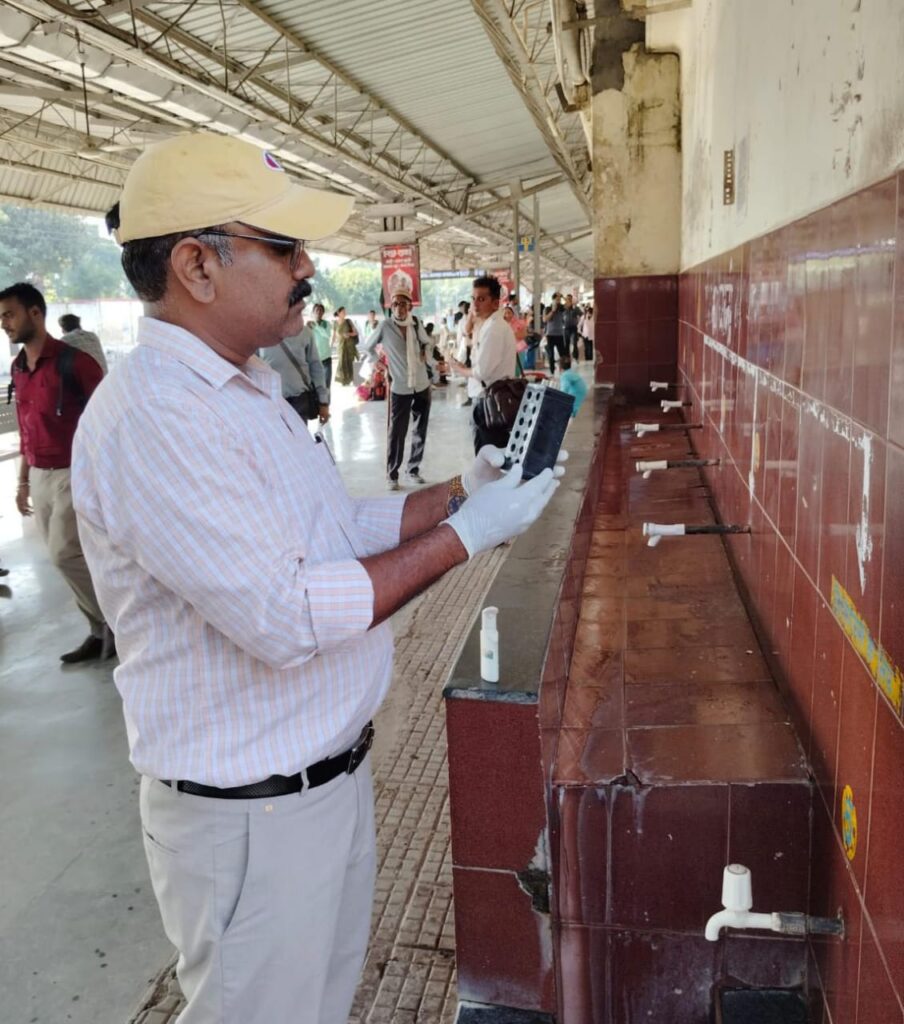 साथ ही कुछ रेलवे स्टेशनों पर पानी का नमूना लेकर उसमें क्लोरीन की मात्रा नाप कर जल की शुद्धता की जाँच की गई और स्टालों पर मौजूद पैक्ड खाद्य पदार्थों, पानी बोतलों एवं स्टेशन परिसर के नल से पानी का नमूना संकलित कर लैब को जाँच के लिए भेजा गया। स्वच्छ नीर अभियान‘‘ के अन्तर्गत रेलवे स्टेशनों, रेलवे कालोनियों, स्वास्थ्य इकाईयों, प्रशिक्षण केन्द्रों एवं कार्यालयों में स्वच्छ जल की उपलब्धता सुनिश्चित करते हुए लीक हो रहे पाईपों की मरम्मत, फिल्टर संयंत्र सहित सभी पानी उपचार संयंत्रों का निरीक्षण किया गया, जहाँ कहीं भी टूटे आईटम मिले तो उन्हें बदला गया।