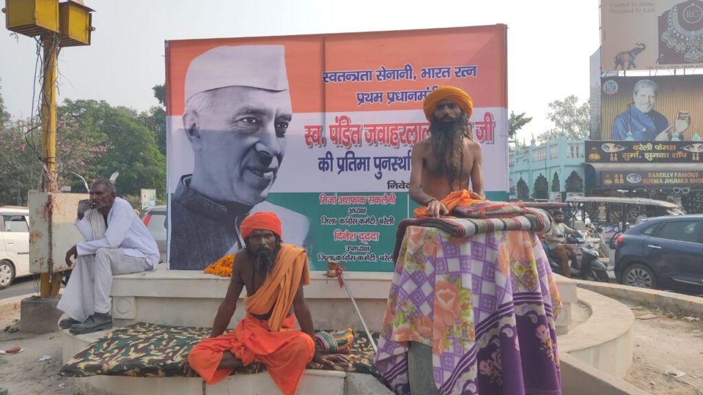 बरेली।जिला कांग्रेस कमेटी के तत्वाधान में चौकी चौराहा स्थित महात्मा गांधी प्रतिमा पार्क पर आज सातवे दिन भी उत्तर प्रदेश कांग्रेस कमेटी के प्रदेश प्रवक्ता गुरु जी डॉ के बी त्रिपाठी , जिला कांग्रेस कमेटी के अध्यक्ष मिर्जा अशफाक सकलैनी, जिला उपाध्यक्ष दिनेश दद्दा, जिला महासचिव उल्फत सिंह कठेरिया इसके अलावा योगी कल्याण समिति के संस्थापक योगी विजय देव नाथ महाराज जी भी अनशन पर बैठे गए। कल्याण समिति के संस्थापक योगी विजय देव नाथ महाराज जी सहित दो बाबा अनशन पर बैठ गए है। बाबाओं का कहना है कि साथ महीने पहले चाचा नेहरू की प्रतिमा को सौन्द्रीयकरण करने के नाम पर हटा दिया गया था इसके बाद आजतक उनकी प्रतिमा नहीं लगाई , पता चला कि उनकी मूर्ति कूड़ा करकट में मिली । यह देश और समाज के लिए शर्मनाक है। इस मौके पर बाबा हठ योगी विजय नाथ ने बताया कि वह अभी आज से अनशन पर बैठे है। अगर मूर्ति नहीं लगी तो अपने साथ छोटे बड़े 12 कुत्तों के साथ एक गाय और अपने एक शिष्य के साथ धरने पर बैठ जायंगे । और तब तक नहीं उठेंगे जब तक देश के प्रथम प्रधानमंत्री जवाहर लाल नेहरू की मूर्ति नहीं लग जाती है।उनकी मांग है कि प्रशासन जल्द से जल्द 14 नवंबर से पहले चौराहे पर मूर्ति लगा दे।उपस्थित कांग्रेस जनों मे उत्तर प्रदेश कांग्रेस कमेटी के महासचिव कुमुद गंगवार, महानगर अध्यक्ष अजय शुक्ला, जिला प्रवक्ता पंडित राज शर्मा, जिला उपाध्यक्ष हेमेंद्र शर्मा एडवोकेट , उपाध्याय ईलयास अंसारी, मुराद बेग, जिला उपाध्यक्ष जुनैद हसन एडवोकेट, जिला महासचिव जिया उर रहमान, जिला उपाध्यक्ष राजन उपाध्याय, जिला उपाध्यक्ष सुरेश बाल्मीकि, राहुल गिहार, पूर्व अध्यक्ष मोहम्मद जकी,मुकेश बालमिकि, कमरूद्दीन सैफी, अनिल देव शर्मा, गुड्डू खा, अमित कश्यप, निशाकत अली,मुदित प्रतापी सिंह , रिजवान खान, नाहिद सुल्ताना , बेचे लाल , ईरशाद मंसूरी, रिंकू बाल्मीकि, ईमरान खान, अयाज खान, सुखविंदर सिंह, तबरेज खान, मोईद सिद्दीकी, फरान आदि उपस्थित रहे।