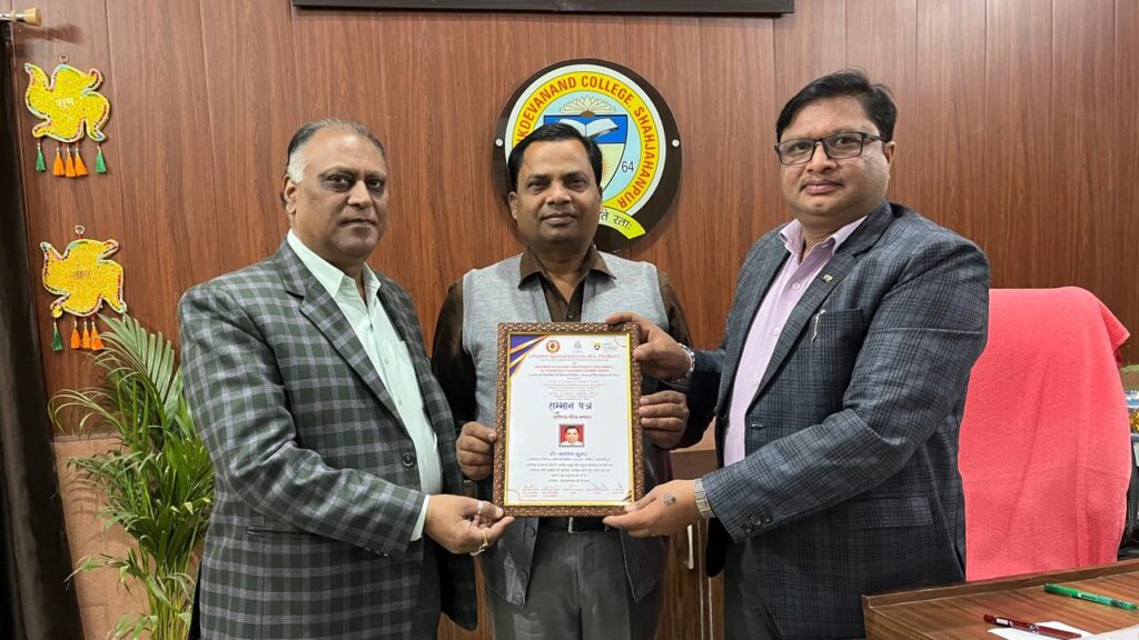 शाहजहाँपुर। एस०एस० कॉलेज के वाणिज्य विभाग के एसोसिएट प्रोफ़ेसर डॉ० कमलेश गौतम को वाणिज्य शिक्षा के क्षेत्र में उल्लेखनीय योगदान देने हेतु नोबेल एकेडमी, पोखरा, नेपाल और उपाधि महाविद्यालय पीलीभीत द्वारा संयुक्त रूप से अंतर्राष्ट्रीय स्तर के “ वाणिज्य गौरव सम्मान” से अलंकृत किया गया । महाविद्यालय के प्राचार्य प्रो० आर० के० आज़ाद और उपप्राचार्य एवं वाणिज्य विभागाध्यक्ष प्रो० अनुराग अग्रवाल ने उन्हें सम्मान पत्र भेंट किया । इस अवसर पर प्रबंध समिति के सचिव डॉ० ए० के० मिश्रा ने उनकी इस उपलब्धि को महाविद्यालय के लिए एक गौरव पूर्ण क्षण बताया । डॉ० देवेन्द्र सिंह, डॉ० गौरव सक्सेना, डॉ० विजय तिवारी, मनोज अग्रवाल, उमाशंकर शर्मा आदि शिक्षको ने डॉ० कमलेश को बधाई दी और हर्ष व्यक्त किया ।