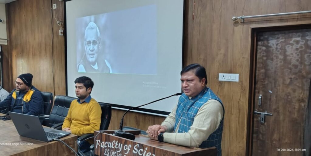 उन्होंने कहा कि आज के राजनीतिज्ञों को भी अटल जी के चिंतन एवं विचारों से प्रेरणा लेते हुए देश की कमान संभालनी चाहिए। कार्यक्रम के संयोजक राजनंदन सिंह राजपूत ने विद्यार्थियों को अटल जी के जीवन एवं उनके शासनकाल में भारत की उपलब्धियों से परिचित कराया। कार्यक्रम में विभिन्न विद्यार्थियों ने “अटल जी एवं सुशासन” विषय पर अपने विचार व्यक्त किए। प्रतियोगिता में बीएससी प्रथम सेमेस्टर के कृष्ण कुमार ने प्रथम, शशांक पांडेय ने द्वितीय एवं अनुज यादव ने तृतीय स्थान प्राप्त किया। विभागाध्यक्ष शिशिर शुक्ला ने अटल जी की कविताओं के माध्यम से विद्यार्थियों को अभिप्रेरित किया। कार्यक्रम में हर्ष पाराशरी, अमित गंगवार, सत्येंद्र कुमार सिंह आदि का सहयोग रहा।