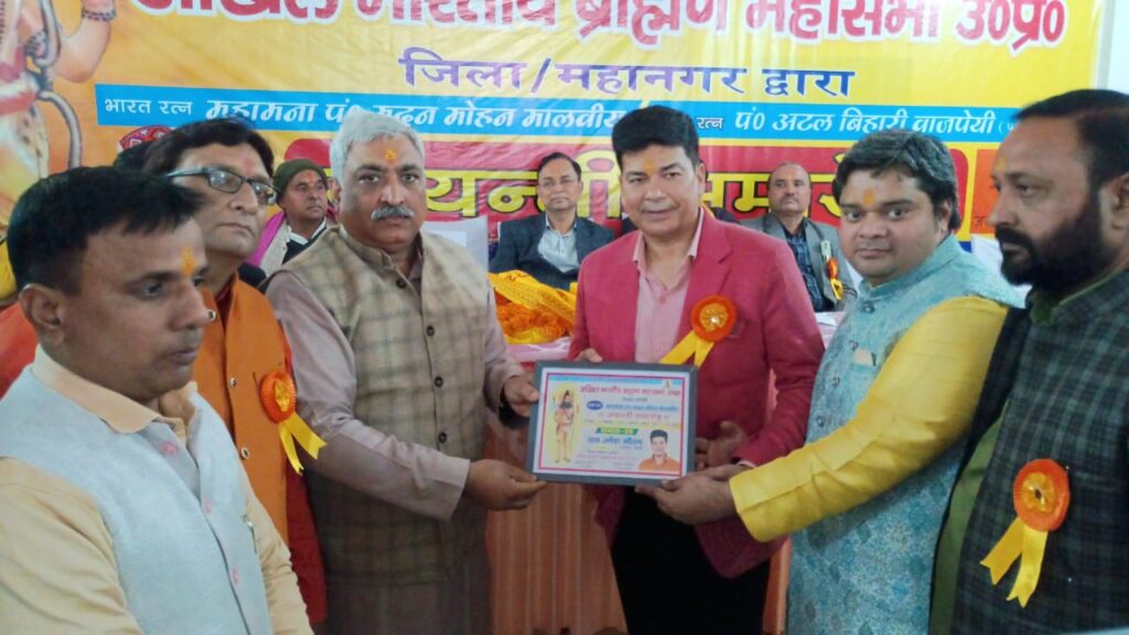 बरेली । अखिल भारतीय ब्राह्मण महासभा बरेली की तरफ से श्री बांके बिहारी कंपलेक्स बदायूं रोड बरेली में मदन मोहन मालवीय और भारत रत्न के अटल बिहारी वाजपेई की जयंती समारोह का आयोजन किया गया कार्यक्रम की अध्यक्षता जिला अध्यक्ष आलोक तिवारी ने की और सभा संचालक प्रदेश वरिष्ठ उपाध्यक्ष डॉक्टर रितेश कुमार शर्मा ने किया कार्यक्रम में सर्वप्रथम मुख्य अतिथि महापौर डॉक्टर उमेश गौतम विशिष्ट अतिथि विधायक डॉ राघवेंद्र शर्मा , डॉक्टर अनिल शर्मा कार्य समिति सदस्य भाजपा डॉक्टर विमल भारद्वाज डायरेक्टर मेडिसिटी वेदांता हॉस्पिटल एवं कृपा वाचक शिवानंद शास्त्री जी के द्वारा किया गया । डॉक्टर राघवेंद्र शर्मा कहा कि भारत रत्न अटल बिहारी वाजपेई राजनीति के अज्ञात हैं उन्होंने कोलकाता राजनीति से उठकर देशहित का कार्य किया डॉ विमल भारद्वाज जी ने संगठन पर चर्चा की और कहा कि कलयुग में संघ की शक्ति है अतः समर्पित रहे इंजीनियर मुख्य पांडे प्रदेश अध्यक्ष ने एसके पांडे को याद किया गया ।