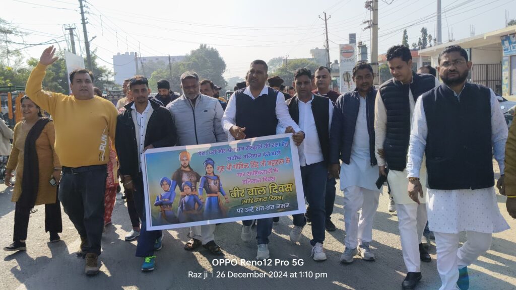 खटीमा। भारतीय जनता पार्टी के कार्यकर्ताओं में आज का दिन वीर बाल दिवस के रूप में मनाया, गुरु गोविंद सिंह के चारों साहब यादव की शहादत को नमन करते हुए भारतीय जनता पार्टी के कार्यकर्ताओं ने चौहान पेट्रोल पंप से गुरुद्वारा सिंह सभा खटीमा तक जुलूस निकाला एवं साहब जड़ों को नमन करते हुए उनको याद किया वाहेगुरु जी का खालसा वाहेगुरु जी की फतेह जो बोले सो निहाल सत श्री अकाल वीर शहीदों का बलिदान याद रखेगा हिंदुस्तान नारे लगाते हुए जुलूस की शक्ल में भारतीय जनता पार्टी के कार्यकर्ता गुरुद्वारा सिंह सभा पहुंचे जहां शहीदों को याद करते हुए उनको नमन किया गया एवं श्रद्धांजलि दी गई वीर बाल दिवस कार्यक्रम में वीर बाल दिवस कार्यक्रम के खटीमा विधानसभा के संयोजक मनोज वाधवा सहसंयोजक नीलू गुप्ता भारतीय जनता पार्टी के प्रदेश कार्यकारिणी सदस्य रमेश चंद्र जोशी नगर अध्यक्ष जीवन धामी झनकार मंडल के अध्यक्ष विमला बिष्ट मंडी अध्यक्ष नंदन सिंह पूर्व जिला पंचायत सदस्य किशन सिंह किन्ना पूर्व छात्र संघ अध्यक्ष सतीश भट्ट पूर्व छात्र संघ अध्यक्ष किशोर जोशी अमित कुमार पांडेय रमेश जोशी रामू भारती रविंद्र राणा कुंदन बोरा नवल वाल्मीकि अनीता ज्याला अंजू देवी सिद्धांत सिंह राजेश गुप्ता एडवोकेट नीरज रस्तोगी ठाकुर जितेंद्र सिंह ठाकुर अनुपम कुमार सिंह रमेश ढींगरा सरदार हरदेव सिंह मानस बत्रा राजेश बाटला करण सतवाल हरीश भट्ट दीपेश तिवारी पप्पू सक्सेना जिला महामंत्री भुवन जोशी संतोष अग्रवाल उपेंद्र सोनकर रोहित वर्मा मोनिश अंसारी मनीष राणा अनवर अहमद प्रमोद गहतोड़ी सिद्ध गुप्ता रवि सक्सेना प्रकाश शर्मा कमल चौहान सुरेश जीना करण यादव राहुल सक्सेना मेहताब राजा प्रियांशु बंसल आदि कार्यकर्ता उपस्थित थे भारतीय जनता पार्टी के वीर बाल दिवस कार्यक्रम के संयोजक मनोज वाधवा ने बताया कि आज के दिन भारतीय जनता पार्टी शहीद वीर बाल दिवस के रूप में अपने धर्म की रक्षा करने वाले शहीद वीरों की याद में पूरे देश में उनकी शहादत को नमन करते हुए माना रही है