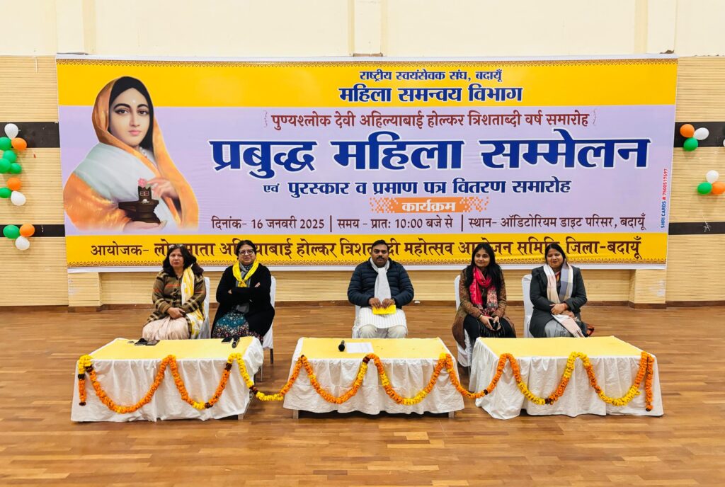 विभाग प्रचारक विशाल जी ने कहा अहिल्याबाई होल्कर आत्मनिर्भरता, प्रतिबद्धता, दूरदर्शिता, युद्धनीति, रणनीति, प्रबंधन, आंतरिक सुरक्षा, साहस, न्यायप्रियता, राष्ट्रीय एकीकरण व स्त्री सशक्तिकरण की श्रेष्ठ प्रतिमान हैं। कार्यक्रम संयोजिका सीमा रानी ने अतिथियों और प्रतिभागियों का आभार जताया। कार्यक्रम का संचालन डॉ० शुभ्रा माहेश्वरी एवं सीमा चौहान ने किया। कार्यक्रम में रजनी मिश्रा, रचना शंखधार, विमलेश गुप्ता, शुभ्रा गुप्ता, चेयरपर्सन बिल्सी ज्ञानदेवी सागर, चेयरपर्सन गुलड़िया तारा देवी, पूर्व चेयरपर्सन दीपमाला गोयल, सपना तोमर, बीना सिंह, कमलेश सिंह, ममता नौगरिया, कमला माहेश्वरी, सीमा राठौर आदि उपस्थित रही।