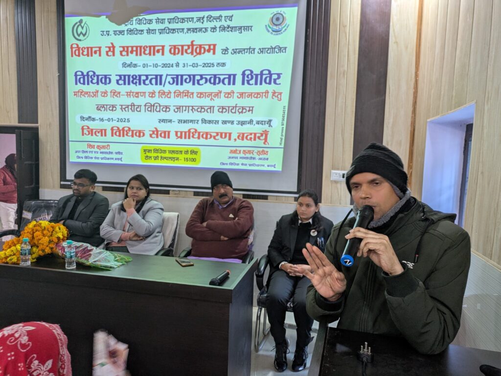 प्रभारी अधीक्षक सामुदायिक स्वास्थ्य केन्द्र उझानी, बदायूँ, डा० राजकुमार गंगवार द्वारा अपने वक्तव्य में कार्यक्रम में उपस्थित महिलाओं को जागरूक करी हुए एंबुलेंस के लिए टोल फ्री नम्बर 108 है इस नम्बर पर आपातकालीन स्थिति में धौबीसों घंटे नि शुल्क सहायता का लाभ प्राप्त कर सकते हैं, एवं 0 से 5 वर्ष तक के बच्चों आदि के लिए भी नि शुल्क एंबुलेंस की सुचिबधा उपलब्ध है। उक्त शिविर के अन्त में अपर जिला जज / सचिव, जिला विधिक सेवा प्राधिकरण, बदायूं शिव कुमारी द्वारा अपने वक्तव्य में बताया कि उक्त विधिक जागरूकता कार्यकम ष्विधान से समाधान के अन्तर्गत महिलाओं की शिकायतों के समाधान में जिला विधिक सेवा प्राधिकरण द्वारा निःशुल्क विधिक सेवायें प्रदान की जाती है, यदि किसी प्रकार महिलाओं के अधिकारों का उल्लंघन होता है तो वह अपने शिकायती प्रार्थना-पत्र कार्यालय जिला विधिक सेवा प्राधिकरण, बदायूं एवं सम्बन्धित थाना में निःसंकोच केस दर्ज करा सकती हैं, महिलाओं के खिलाफ अपराध जैसे एसिड हमला, बलात्कार, अपहरण, दहेज उत्पीडन, एवं यौन उत्पीडन के सम्बन्ध घ में विस्तार पूर्वक बताया इसके अतिरिक्त केन्द्र सरकार एवं राज्य सरकार द्वारा चलायी जा रही योजनाओं का लाभ आप जब ले सकते हैं जब आप जागरूक एवं शिक्षित होगें यदि कोई आपको मानसिक व भावनात्मक रूप से भी प्रताडित करता है तो उसे भी घरेलू हिंसा के अन्तर्गत आता है और इसके लिए कानून में घरेलू हिंसा अधिनियम के रूप में उल्लेखित है एवं दिनांक 08.03.2025 को आयोजित होने वाली राष्ट्रीय लोक अदालत में प्री-लिटिगेशन स्तर पर सुलह समझौते के आधार पर अपने वादों का निस्तारणकरा सकते हैं, तथा सूक्ष्म एवं लघु प्रकृति के वादों को सम्बन्धित न्यायालय के निर्देशानुक्रम में जनपद न्यायालय परिसर में मध्यस्थता केन्द्र खुला हुआ है। उक्त मध्यस्थता केन्द्र के सदस्यों / अधिवक्ताओं द्वारा दोनों पक्षों को बिठाकर समझौता कराया जाता है। इसी कम में बताया कि महिलाओं के सामने आने वाली समस्याओं के समाधान हेतु सैद्धान्तिक ज्ञान के साथ व्यवहारिक ज्ञान अति आवश्यक है। उक्त कार्यक्रम का संचालन, रिसोर्स संरक्षण अधिकारी रवि कुमार द्वारा किया गया साथ ही सरकार द्वारा चलायी जा रहीं विभिन्न प्रकार की योजनाओं के बारे में भी विस्तार पूर्वक जानकारी प्रदान की गयी। इसके अतिरिक्त कार्यक्रम में, खण्ड विकास अधिकारी, उझानी, बदायूं, सर्वज्ञ अग्रवाल, ब्लाक प्रमुख, उझानी बदायूं, शिशुपाल सिंह शाक्य, जिला डी०एल०एस०एस०, बदायूं के तृतीय श्रेणी देवेन्द्र कुमार, चतुर्थ श्रेणी कर्मचारी, संजीव कुमार एवं पराविधिक स्वयं सेवकगण, कार्यालय, खण्ड विकास, अधिकारी, उझानी का समस्त स्टाफ स्वंय प्रकाश गुप्ता, रजनीश कुमार, मोहिनी, व