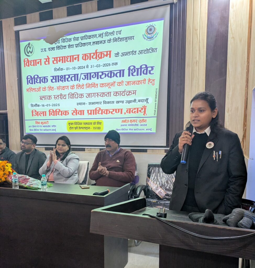बदायूँ। राष्ट्रीय विधिक सेवा प्राधिकरण, नई दिल्ली एवं राष्ट्रीय महिला आयोग के संयुक्त तत्वाधान में एवं उ०प्र० राज्य विधिक सेवा प्राधिकरण, लखनऊ के निर्देशानुक्रम में माननीय जनपद न्यायाधीश / अध्यक्ष, जिला विधिक सेवा प्राधिकरण, बदायूं के निर्देशानुपालन में जिला विधिक सेवा प्राधिकरण, बदायूं द्वारा गुरुवार को महिलाओं के हितार्थ विधिक जागरूकता कार्यकम विधान से समाधान के अन्तर्गत विधिक साक्षरता / जागरूकता शिविर का आयोजन ब्लाक- उज्ञानी, जनपद बदायूं में आयोजित किया गया।