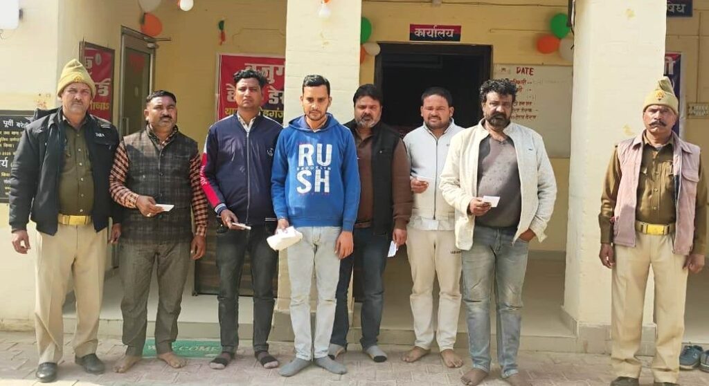 बरेली । थाना फतेहगंज पूर्वी पुलिस ने चैंकिंग के दौरान हार जीत की बाजी लगाकर जुआ खेलते हुए 6 अभियुक्तों को माल फड़ से 107100 रूपये व जामा तलाशी से 8900 रूपये व 5 मोबाइल फोन सहित किया गया गिरफ्तार बरेली। प्रभारी निरीक्षक फतेहंज पूर्वी के नेतृत्व में थाना फतेहगंज पूर्वी पुलिस टीम द्वारा रात्रि गश्त , चैकिंग के दौरान हार जीत की बाजी लगाकर जुआ खेलते हुए ग्राम गुलड़िया मकरन्दपुर थाना फतेहगंज पूर्वी के जंगल से 6 अभियुक्त जिसमें जितेन्द्र कुमार पुत्र नन्हेलाल निवासी ग्राम ढकनी थाना फरीदपुर, कामिल उर्फ छोटे पुत्र शाबिर निवासी मोहल्ला कस्साबान सब्जी मण्डी कस्बा व थाना फरीदपुर , फरहतउल्ला पुत्र लियाकत उल्ला निवासी मोहल्ला मिर्धान कस्बा व थाना फरीदपुर , अर्पित कुमार पुत्र अशोक कुमार निवासी मोहल्ला सराय कस्बा व धाना फरीदपुर , गुड्डू पुत्र नत्थू निवासी सैदपुर थाना बिधरीचैनपुर , सन्तोष कुमार पुत्र सूरजपाल निवासी बिलौआ थाना फरीदपुर को माल फड से 107100 रूपये व जामा तलाशी से 8900 रूपये व 5 मोबाइल फोन के साथ गिरफ्तार किया। बरामदगी व गिरफ्तारी के आधार पर उपरोक्त अभियुक्तों के विरूद्ध जुआ अधिनियम में थाना फतेहगंज पूर्वी पर मुकदमा पंजीकृत किया गया। पुलिस टीम में प्रभारी निरीक्षक संतोष कुमार , उनि धर्मेन्द्र कुमार शर्मा, उनि सहेन्द्र पाल मलिक, उनि सुनील कुमार चौधरी, उनि यूटी संगम शर्मा, हेका मौ० इजहार खाँ, हेड कांस्टेबल मोहम्मद जमशेद, हेका बलवीर सिंह, गौतम कुमार आदि मौजूद थे।