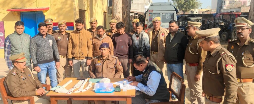बरेली । थाना भुता द्वारा मुठभेड़ के दौरान पशु चोर गिरोह के 4 सदस्यों को पुलिस ने किया गिरफ्तार, एक अभियुक्त पैर में गोली लगने से घायल, कब्जे से अवैध असलाह मय कारतूस, गाड़ी, 20 हजार रुपये नगद व अन्य सामान बरामद किया किया। थाना भुता के प्रभारी निरीक्षक के नेतृत्व में थाना भुता पुलिस टीम, एसओजी व सर्विलांस टीम के सहयोग से थाना भुता क्षेत्रान्तर्गत ग्राम अधकटा जंगल में अभियुक्तगण सूरजपाल पुत्र होरीलाल निवासी ग्राम धर्मपुर थाना हाफिजगंज, मोहम्मद जीशान पुत्र इकबाल अहमद निवासी ग्राम डांगा थाना जहानाबाद जनपद पीलीभीत मोहम्मद शानू पुत्र मोहम्मद रहीश अहमद निवासी ग्राम मुड़िया जागीर थाना देवरनियां , मोहम्मद सैफ पुत्र कल्लू निवासी ग्राम मुड़िया जागीर थाना देवरनियां जनपद को पुलिस मुठभेड़ के दौरान गिरफ्तार किया गया है। गिरफ्तार अभियुक्तगणों को पुलिस टीम द्वारा टोंकने पर अभियुक्तों द्वारा जान से मारने की नियत से अवैध असलहों से पुलिस टीम पर फायर किये गये, जिसमें पुलिस पार्टी द्वारा आत्मरक्षार्थ की गयी जबाबी कार्यवाही में अभियुक्त सूरजपाल उपरोक्त के दाहिने पैर में गोली लगने से घायल हुआ तथा बदमाशों द्वारा की गयी फायरिंग में आरक्षी मोहित कुमार के बाये हाथ में गोली लगने से घायल हुआ, घायल अभियुक्त सूरजपाल व आरक्षी मोहित कुमार उपरोक्त को उपचार हेतु जिला चिकित्सालय बरेली भेजा गया। गिरफ्तार शुदा अभियुक्तों के विरूद्ध नियमानुसार विधिक कार्यवाही की गयी। अभियुक्त मोहम्मद नवीं पुत्र मोहम्मद रफी निवासी ग्राम श्यामपुर गौटिया (उड़ला जागीर) थाना बिथरी चैनपुर नईम पुत्र अंसार उर्फ अली जान निवासी ग्राम पदारथपुर थाना बिथरी चैनपुर , इकबाल अली पुत्र पप्पू शाह निवासी ग्राम श्यामपुर गौटिया (उड़ला जागीर) थाना बिथरी चैनपुर , शरीफ पुत्र शब्बीर कुरैशी निवासी फिरोजपुर थाना शाही, सोहिल पुत्र कल्लू निवासी ग्राम देवरनिया मुड़िया थाना देवरनिया जनपद बरेली अंधेरे का फायदा उठाकर मौके से फरार हो गये।