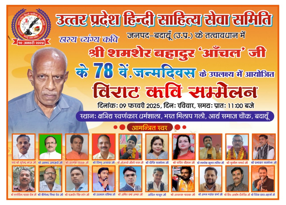 बदायूं । 9 फरवरी को शहर के प्रतिष्ठित वरिष्ठ हास्य व्यंग्य के कवि शमशेर बहादुर आंचल जी के 78 वे जन्म दिवस पर उत्तर प्रदेश साहित्य सेवा समिति बदायूं के तत्वाधान में एक विराट कवि सम्मेलन का आयोजन अधिवक्ता अनिरुद्ध राय सक्सेना के संयोजन में किया गया है जिसमें जिले के आसपास के कविजन ब शायर एकत्र होकर आँचल जन्मोत्सव में सहभागी बन काव्यपाठ करेंगे कवि सम्मेलन का आयोजन स्वर्णकार धर्मशाला भारत मिलाप गली आर्य समाज बदायूं में दोपहर 12:00 से प्रारंभ होगा कार्यक्रम में मुख्य अतिथि महेश चंद्र गुप्ता जी पूर्व राज्य मंत्री होंगे व कार्यक्रम की अध्यक्षता वरिष्ठ कवि शमशेर बहादुर आंचल करेंगे यह जानकारी उत्तर प्रदेश साहित्य सेवा समिति बदायूं के सचिव अमित वर्मा अंबर ने दी।