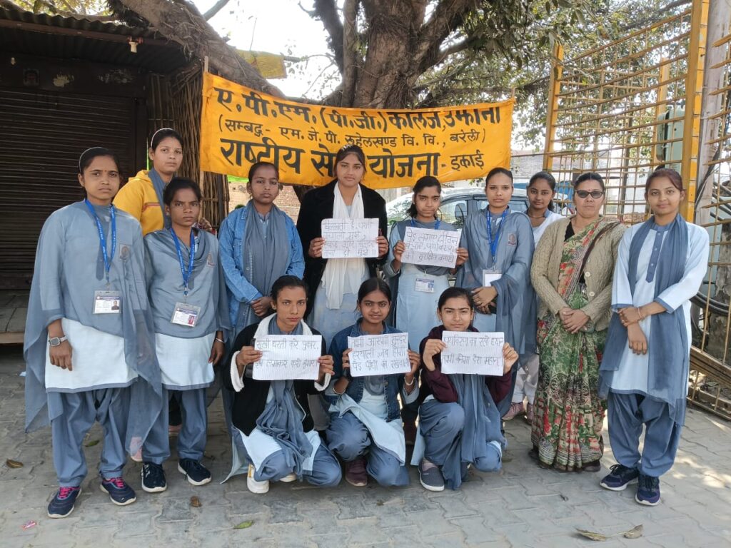 उझानी ।अयोध्या प्रसाद मेमोरियल डिग्री कॉलेज में राष्ट्रीय सेवा योजना के सात दिवसीय शिविर के अंतरगत पंचम दिवस, कार्यक्रम अधिकारी डॉक्टर महेश पाल सिंह यादव व डॉक्टर शिल्पी पांडे के नेत्रत्व में स्वयंसेवकों व स्वयंसेविकाओं ने अपने चयनित ग्राम गंगोरा व सरोरा मे पर्यावरण संरक्षण पर रैली निकालकर व नारो के माध्यम से ग्राम वासियों को पर्यावरण संरक्षण के प्रति जागरुक किया व घर-घर जाकर लोगों को प्लास्टिक का उपयोग न करने के लिए प्रेरित किया बौद्धिक सत्र में महाविद्यालय के प्रोफ़ेसर सौरभ शुक्ला ने ग्राम वासियों को सम्बोधित करते हुए कहा हमें पर्यावरण को प्रदुषित होने से बचाना चाहिए और पर्यावरण संरक्षण के लिए सभी को जागरूक रहना चाहिए। इस अवसर पर प्रोफेसर शिशुपाल सिंह , डॉक्टर त्रिवेंद्र सिंह, शालिनी शर्मा, डॉ.सुष्मिता, आदर्शकांत, दौलतराम, अंशुल, मोनिका आदि उपस्थित रहे!