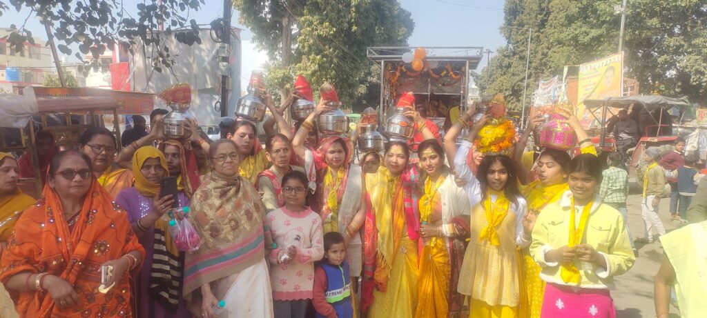 उझानी :- नगर के रामलीला ग्राउंड सिथ्ति नागेश्वर शिव मंदिर पर दो दिवसीय प्राण-प्रतिष्ठा समारोह में आज सुबह शिव-परिवार व राम दरबार की मूर्तियों का नगर भ्रमण कराया गया। महिलाओं ने मंगल गीत गाते हुए कलश धारण किए। शोभायात्रा के बाद मंदिर परिसर में भगवान् की मूर्तियों की प्राण-प्रतिष्ठा की गई। दोपहर से चले भंडारे में हजारों श्रृद्धालुओं ने प्रसाद ग्रहण किया। पं शेलेद्र शर्मा ने आज के यजमान पारसमणी वार्ष्णेय व रश्मि वार्ष्णेय, ललित कुमार इन्ना बावू, निशांत वार्ष्णेय द्वारा मूर्तियों को स्नान व पूजन-अर्चन कराकर रथ पर विराजमान कराया। नगर के विभिन्न मार्गों व मंदिरों पर घूमी शोभायात्रा का श्रृद्धालुओं ने पुष्प बर्षा कर स्वागत किया। वही नवनिर्मित भगवान की मूर्तियों की आरती उतार कर प्रसाद का वितरण किया । दोपहर से शुरू भंडारे में हजारों श्रृद्धालुओं ने भोलेनाथ व राम जी की जय-जयकार करते हुए प्रसाद पाया । इस मौके पर निशांत वार्ष्णेय ,शोभित वार्ष्णेय , सतीश चन्द्र ,ललित वार्ष्णेय , श्रवण कुमार, शिवम् वार्ष्णेय,अनुज वार्ष्णेय, विशेष कुमार, अर्जुन,चेतन वार्ष्णेय आदि भक्तगण मौजूद रहे !
