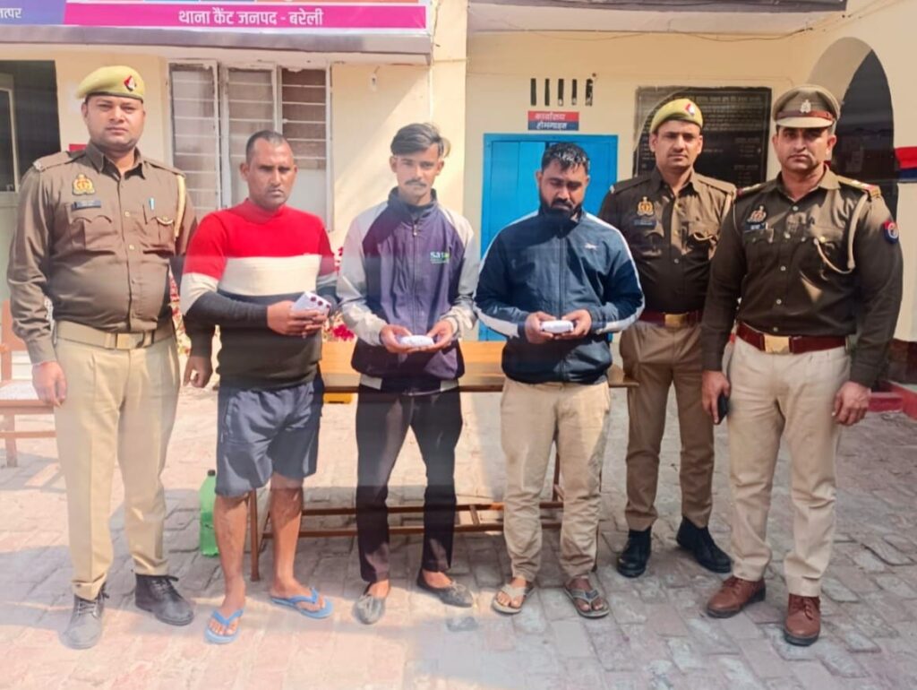 बरेली। थाना कैंट प्रभारी निरीक्षक के नेतृत्व पुलिस टीम द्वारा चैकिंग के दौरान मुखबिर की सूचना पर कृष्णा कॉलोनी सरकारी ट्यूबवेल के पास से अभियुक्त जसवीर यादव पुत्र हरवीर सिहं निवासी शांति विहार थाना सुभाषनगर, मूल निवासी सराय तलफी, सचिन यादव पुत्र पवन यादव निवासी भरतौल , नूरेन पुत्र जमील अहमद निवासी कस्बा व थाना विशारतगंज को गिरफ्तार किया। जसवीर के पास से चरस मात्रा 500 ग्राम, सचिन के पास से चरस मात्रा 200 ग्राम, नूरेन के पास से चरस मात्रा 300 ग्राम बरामद की गयी है। इस सम्बन्ध में थाना कैन्ट में मुकदमा पंजीकृत किया गया। गिरफ्तार करने बाली पुलिस में उनि मोहित चौधरी प्रभारी चौकी नकटिया, कांस्टेबल रियाज अली, हेड कांस्टेबल मुकुट सिंह , कांस्टेबल अजय कुमार , प्रिंस मौजूद रहे।