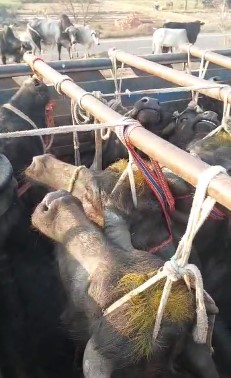सालारपुर। एक दर्जन से अधिक पशुओं से भरी पिकअप को नवादा चौकी पुलिस ने पकड़ा है पशुओं को क्रूरता के साथ शाहजहांपुर से अलीगढ़ को ले जाया जा रहा था ।वहीं पशु प्रेमी बीकेंद्र शर्मा की सूचना नवादा चौकी पुलिस ने थाना सिविल लाइन क्षेत्र के मैगी पॉइंट के पास पकड़ लिया । सोमवार शाम लगभग साढ़े चार बजे नवादा चौकी के पास से एक पिकअप वाहन गुजरा जिससे पशुओं की आवाज आ रही थी इसकी सूचना बिकेंद्र शर्मा ने नवादा पुलिस को दी पुलिस ने तत्परता दिखाते हुए पटेल चौक से उझानी वाईपास मैगी पॉइंट के पास गाड़ी को रोक लिया इस मौके पर पीपल फॉर एनीमल्स संस्था के अध्यक्ष बिकेंद्र शर्मा भी पहुंच गए उन्होंने पुलिस के सामने गाड़ी को खुलवाकर देखा तो उसमें 15 महिशवंशिये पशु क्रूरता के तहत रस्सियों से बांधकर भरे हुए थे सभी के मुंह से चीखने की आवाज आ रही थी । पशुओं को गाड़ी से नीचे उतरवाया गया। वाहन चालक ने अपना नाम सोहिल व परिचालक ने शाहरुख बताया ।जो शाहजहांपुर से अलीगढ़ को ले जा रहे थे । जिनके पास वाहन से पशुओं को ले जाने का कोई परमिट नहीं था ।बिकेंद्र शर्मा ने पुलिस को तहरीर देते हुए दोनों युवकों के खिलाफ पशु क्रूरता व बिना परमिट पशु परिवहन करने और मानकों का उलंघन की धाराओं मुकदमा पंजीकृत कर कार्यवाही करने की मांग की है। पुलिस गाड़ी को कब्जे में लेकर जांच कर रही है ।