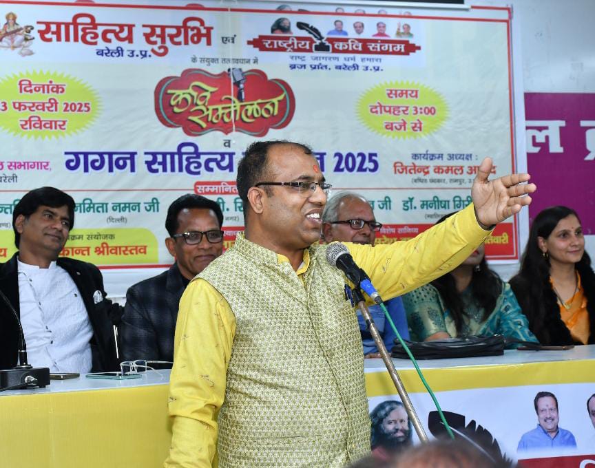 बरेली।राष्ट्रीय कवि संगम ब्रज प्रांत बरेली व साहित्य सुरभि बरेली के संयुक्त तत्वाधान में गीतकार राममूर्ति गौतम गगन की स्मृति में खुशलोक सभागार बरेली में कवि सम्मेलन का आयोजन किया गया। कवि सम्मेलन में कार्यक्रम के मुख्य अतिथि डॉ विनोद पागरानी,साहित्यकार जितेंद्र कमल आनंद,संयोजक विश्वजीत निर्भय,कमलकांत श्रीवास्तव, रोहित राकेश व राम कुमार कोहली के करकमलो द्वारा दिल्ली से पधारे मोहन मुन्तजिर,पंतनगर के डॉ के पी सिंह,हाथरस की गीत “गीत” ग्वालियर की कवियत्री डॉ मनीष गिरी,दिल्ली की कवियत्री नमिता नमन, सीतापुर की कवयित्री हेमा पांडेय,बरेली के गीतकार सुरेश ठाकुर को “गगन साहित्य सम्मान” से सम्मानित किया गया। कवि सम्मेलन में कार्यक्रम अध्यक्ष जितेंद्र कुमार आनंद की पुस्तक का लोकार्पण भी किया गया। कवि सम्मेलन में पंत नगर से पधारे कवि डॉ के पी सिंह ने दिवंगत साहित्यकार गगन को याद करते हुए कहा देखते -देखते शम्स ढल जाएगा। हाथ से वक्त यूँ ही निकल जाएगा। छाेड़के यह जहां सबकाे जाना ही है, आज काेई गया काेई कल जाएगा। कमलकांत श्रीवास्तव ने कहा औरों के लिए जीलों जग में, बस नाम यहां रह जाता है ।