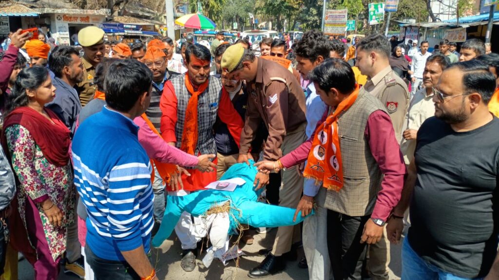 बरेली। तानाशाह मुगल शासक औरंगजेब का समर्थन करने वाले मुस्लिम नेताओं का पुतला फूंकने पहुंचे शिवसैनिकों से पुलिस ने पुतला छीना , शिवसैनिकों ने प्रधानमंत्री को संबोधित ज्ञापन एसडीएम देशराज को दिया। शिवसेना पश्चिमी उत्तर प्रदेश एकनाथ शिंदे गुट के जिला प्रमुख दीपक पाठक के नेतृत्व में कार्यकर्ताओं ने सेठ दामोदर स्वरूप पार्क से प्रदर्शन करते हुए जिलाधिकारी गेट पहुंचे । जिलाधिकारी गेट पर शिव सैनिकों ने महाराष्ट्र के सपा विधायक अबू आजमी और बरेली के मौलाना शहाबुद्दीन का पुतला फूंकने का प्रयास किया पुलिस ने मौके से दोनों पुतलों को छीन कर अपने कब्जे में ले लिया उसके बाद दीपक पाठक ने प्रधानमंत्री संबोधित एसडीएम को ज्ञापन सोपा। दीपक पाठक ने कहा कि महाराष्ट्र में तानाशाह मुगल शासक औरंगजेब ने छत्रपति शिवाजी महाराज के विरुद्ध युद्ध लड़ा और हिन्दू धार्मिक तीर्थस्थलों एवं मन्दिरों को तोड़कर जबरन मस्जिदों, मकबरों व कब्रिस्तानों में परिवर्तित किया और हिन्दू जनमानस की आस्थाओं पर अत्याचार किया।