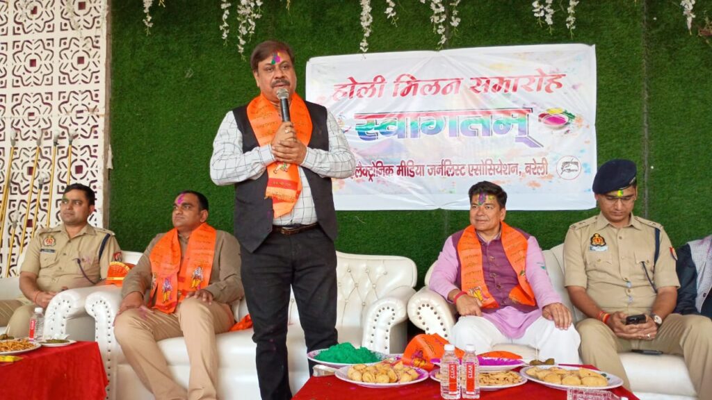 और मिठाइयां बांटीं। प्रोग्राम में यह अधिकारी रहे शामिल.. इलेक्ट्रॉनिक मीडिया संगठन के होली मिलन समारोह में एसएसपी अनुराग आर्य को पगड़ी पहनाते अध्यक्ष अलोक गुप्ता (सिटिल )साथ में बरेली रेंज के आईजी राकेश कुमार, नगर आयुक्त आईएएस संजीव कुमार मौर्य, जिला सूचना अधिकारी नीतू कनौजिया, आरटीओ बरेली कमल गुप्ता , आरटीओ दिनेश कुमार,एआरटीओ मनोज कुमार,,पॉल्यूशन कंट्रोल अधिकारी चंद्रेश जयसवाल, रजिस्ट्रार यादवेंद्र पाठक, कार्यक्रम मे उपस्थित लोकप्रिय मेयर उमेश गौतम , शहर कप्तान मानुष पारीक, उपजा के अध्यक्ष पवन सक्सेना व अन्य अधिकारीगण व पत्रकार साथी… इस रंगारंग कार्यक्रम ने न केवल पत्रकारों को आपस में जोड़ने का काम किया, बल्कि समाज में एकता और सौहार्द का संदेश भी दिया इस मुबारक़ मोके पर,अलोक गुप्ता सिटिल (अध्यक्ष,)डॉ पवन सक्सेना, सिटी इंचार्ज अमृत विचार राकेश शर्मा,रंदीप सिंह,विकास साहनी,कृष्ण राज यादव, दीपक शर्मा, कुमार विनय, मोनू पांडे, अरुण कुमार, धीरू यादव,मनोज गोस्वामी,शशांक राठौर, मयंक गुप्ता,अजय शर्मा, अयाज खान, मयंक गुप्ता,प्रवीण कुमार, भागीरथ गोस्वामी, शशांक राठौर, फिरोज खान, मुकेश तिवारी, वीरेंद्र अटल, अरुण जयसवाल, अभिषेक कुमार, अभिषेक कुमार, शरीक नवेद, गुलरेज खान,।