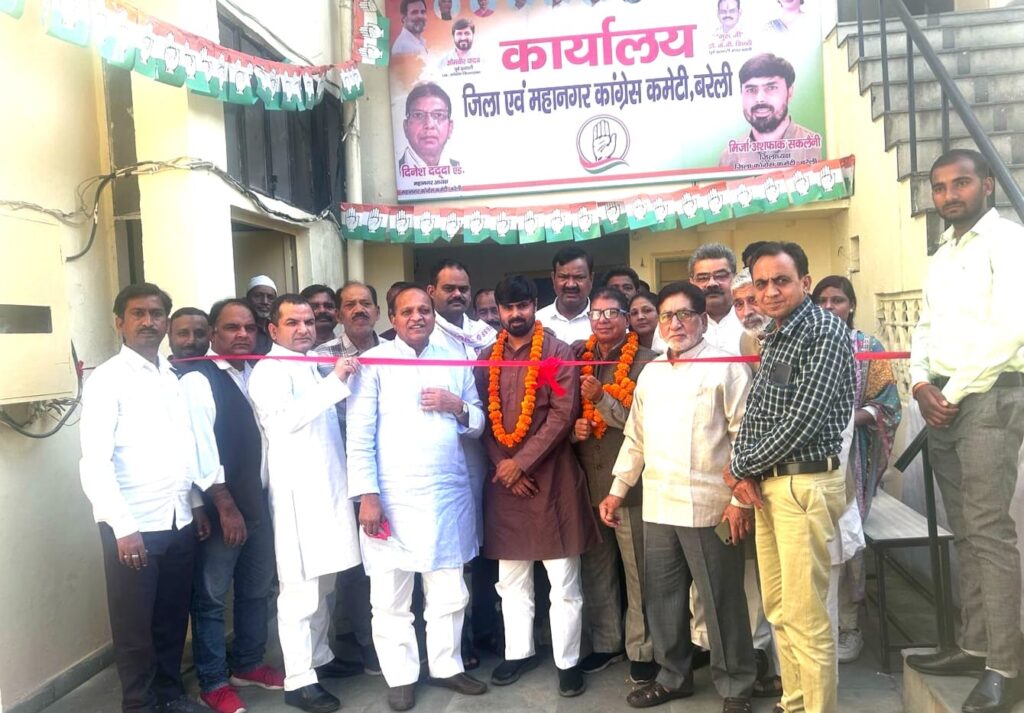 बरेली। जिला एवं महानगर कांग्रेस कमेटी का संयुक्त कार्यालय रामपुर गार्डन धनवंतरी तोमर चौराहा डॉक्टर तोमर के अस्पताल के सामने खोला गया है । जिसका उद्घाटन वरिष्ठ कांग्रेस जनों एवं प्रदेश पदाधिकारीयों की उपस्थिति में नवनियुक्त जिला कांग्रेस कमेटी के जिला अध्यक्ष मिर्जा अशफ़ाक सकलैनी एवं नवनियुक्त महानगर कांग्रेस कमेटी के अध्यक्ष दिनेश दद्दा ने काटकर किया। जिला कांग्रेस कमेटी के अध्यक्ष मिर्जा अशफ़ाक सकलैनी ने कहा की अब एक नए युग की शुरुआत होने जा रही है हम सभी को मिलकर एकजुट होकर कांग्रेस पार्टी और संगठन के लिए काम करना है वरिष्ठ कांग्रेस जनों के सहयोग से हमें संगठन का ग्राम स्तर तक विस्तार करना है। महानगर कांग्रेस कमेटी के अध्यक्ष दिनेश दद्दा ने कहा कि अभी तक जिला एवं महानगर संगठन की गतिविधियां अलग-अलग जगहो से संचालित हो रही थी लेकिन अब एक जगह से एक ही कार्यालय से जिला एवं महानगर संगठन अपना कार्य करेगा और सभी पदाधिकारीयों की बारी-बारी से कार्यालय पर ड्यूटी लगाई जाएगी ताकि कोई भी फरियादी यहां से वापस ना लौट सके । इस अवसर पर पूर्व महापौर प्रत्याशी गुरु जी डॉक्टर के बी त्रिपाठी ने कहा कि अभी तक जिला एवं महानगर कांग्रेस कमेटी के अलग-अलग कार्यालय थे और कार्यक्रम भी अलग-अलग हो रहे थे जिससे कार्यकर्ताओं में संदेश अच्छा नहीं जा रहा था लेकिन अब संयुक्त रूप से दोनों अध्यक्ष इस कार्यालय में बैठेंगे और एक साथ कार्यक्रम होगे। उपस्थित कांग्रेस जनो मे निवर्तमान प्रदेश उपाध्यक्ष प्रेम प्रकाश अग्रवाल, पूर्व प्रत्याशी कृष्ण कांत शर्मा पूर्व प्रत्याशी नवाब मुजाहिद हसन खा, पूर्व चेयरमैन ईलयास अंसारी, जिया उर रहमान, सुरेश बाल्मीकि, मुकेश बाल्मीकि, ईदुल हसन , राजन उपाध्याय, पाकिजा खान, कमरुद्दीन सैफी, नजमी खान जोया, अमजद खान, आबिद रजा, नदीम सिद्दीकी, मोईद सिद्दीकी, रियाजुल प्ररधान, युसूफ नन्हें, कलीम अखतर, मो जकी, मोबीन कुरैशी, डॉ सरताज आदि कांग्रेस जन उपस्थित रहें।