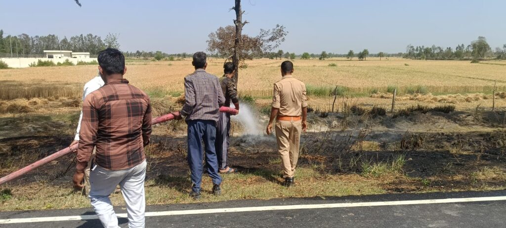 मुजरिया। कछला मार्ग पर ड्रग हाउस धर्मपुर के पास की गोदाम के पास महेंद्र सिंह पाली उनके खेत में आग आग लग गई जिससे मौके पर पहुंची पीआरबी चालक नंदराम यादव आरक्षी अंकुश कुमार उन्होंने आनन फानन में फायर ब्रिगेड गाड़ी को फोन करके बुलाया तब जाकर आग पर काबू पाया गया जिससे किसान की फसल राख होने से बाल बाल बची घटना दोपहर 2:00 बजे के करीब की है इस मार्ग पर किसी ने जलती हुई बीड़ी या जलती हुई सिगरेट रोड के किनारे फेंकने से तेज हवा के झोंके से लगती गई और किसानों के खेत में बढ़ती गई इतनी पर पीआरबी फायर ब्रिगेड गाड़ी को बुलाकर आग पर काबू पाया जिससे सैकड़ो बीघा गेहूं की फसल आग की चपेट से बाल बाल बच गए इतना ही नहीं अग्निशमन विभाग के पुलिस कर्मियों ने अथक मेहनत व प्रयास के बाद आग पर काबू पा लिया जो कुछ एक दो बीघा गेहूं किसानों के जल ही पाए थे