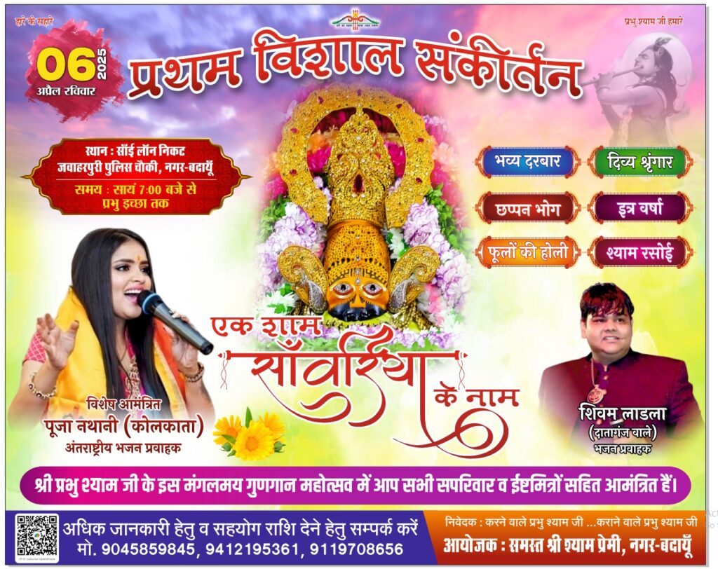 बदायूं। एक शाम सांवरिया के नाम कार्यक्रम में कोलकाता की अंतरराष्ट्रीय भजन गायिका पूजा नथानी भजन पेश करेंगी शिवम लाडला दातागंज वाले भजन प्रवाहक,करिश्मा श्याम दीवानी भजन गायिका भी भजन पेश करेगी। बदायूं में यह कार्यक्रम 06 अप्रैल को साईं लॉन निकट जवाहरपुरी पुलिस चौकी के पास सायं 7 बजे शुरू होगा। भव्य दरबार , दिव्य श्रृंगार , छप्पन भोग , इत्र वर्षा , फोलो की होली , श्याम रसोई आदि कार्यक्रम होंगे।