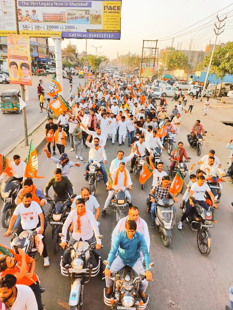 गाजियाबाद। भाजपा जिला गाजियाबाद लोनी विधानसभा क्षेत्र में पार्टी स्थापना दिवस के शुभ अवसर पर आयोजित बाइक रैली जिलाध्यक्ष चौधरी चैनपाल सिंह की अध्यक्षता एवं युवा मोर्चा जिला अध्यक्ष हिमांशु शर्मा की अगुवाई में संपन्न हुई। बाइक रैली करवां बैंक्विट हॉल पाभी से आरंभ होकर नाईपुरा सरकारी अस्पताल पर समाप्त हुई। इसमें सैकड़ो की संख्या में पार्टी कार्यकर्ताओं ने भाग लिया। भाजपा युवा मोर्चा के क्षेत्रीय उपाध्यक्ष आर्यन त्यागी मुख्य अतिथि के रूप में बाइक बरेली में उपस्थित रहे। समापन कार्यक्रम पर जिला अध्यक्ष चौधरी चैनपाल सिंह ने पार्टी कार्यकर्ताओं को संबोधित करते हुए कहा कि उत्तर प्रदेश सरकार के 8 वर्ष सेवा सुरक्षा और सुशासन के पूर्ण होने पर प्रदेश भर में है कार्यक्रम चल रहे हैं विभिन्न आयामों के माध्यम से पार्टी कार्यकर्ता भारी निष्ठा के साथ जिला मंडल एवं बूथ स्तर तक कार्यक्रमों को सफल बनाने के लिए लगे हुए हैं।युवा मोर्चा जिला अध्यक्ष हिमांशु शर्मा ने कार्यक्रम को सफल बनाने के लिए सभी पार्टी कार्यकर्ताओं का आभार व्यक्त किया।बाइक रैली के दौरान पार्टी कार्यकर्ताओं का उत्साह देखने को मिला। कार्यक्रम में मुख्य रूप से जिला महामंत्री राजेंद्र बाल्मीकि, जिला उपाध्यक्ष रामकुमार त्यागी, कौमुदी चौधरी, जिला मंत्री सुदेश भारद्वाज, राहुल बैंसला, आकाश गौतम, मिडिया प्रभारी धजेन्द्र खारी धजय मंडल अध्यक्ष राहुल श्याम सुंदर, मनीष चौहान, संतोष मिश्रा, जितेंद्र गुप्ता आदि सहित पार्टी के पदाधिकारीगण, जनप्रतिनिधि मोर्चों के पदाधिकारी एवं पार्टी कार्यकर्ता उपस्थित रहे।