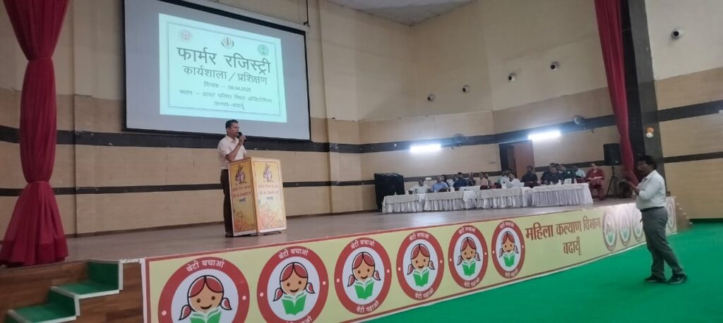 बदायूं:। डायट परिसर स्थित ऑडिटोरियम में फार्मर रजिस्ट्री कार्यशाला का आयोजन किया गया, जिसमें निधि श्रीवास्तव जिलाधिकारी, केशव कुमार मुख्य विकास अधिकारी, अरूण कुमार अपर जिलाधिकारी (प्रशासन) जनपद के समस्त उपजिलाधिकारी, मनोज कुमार उप कृषि निदेशक, दुर्गेश कुमार जिला कृषि अधिकारी, रमन मिश्रा जिला पूर्ति अधिकारी, समस्त खण्ड विकास अधिकारी, समस्त तहसीलदार, नायब तहसीलदार, पंकज सक्सेना अध्यक्ष प्रधानसंघ व मंत्री, कोटेदार संघ के अध्यक्ष तथा मंत्री, समस्त लेखपाल, समस्त पंचायत सहायक, तथा कृषि विभाग के कार्मिक उपस्थित थे।