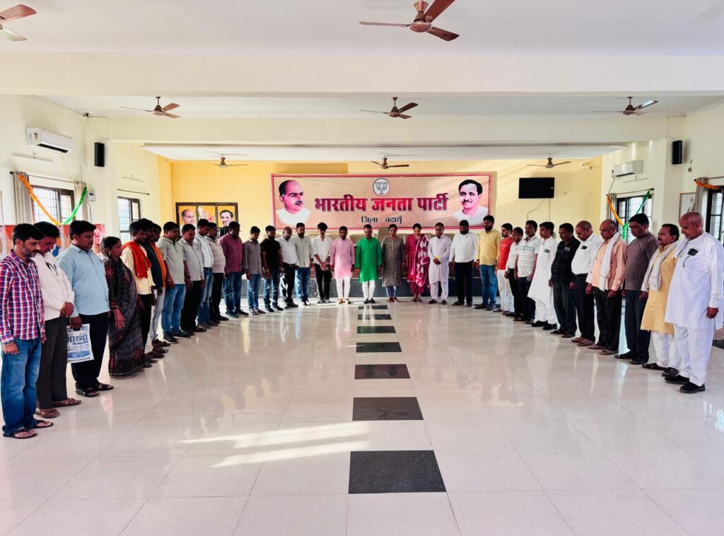 बदायूं। कश्मीर के पहलगाम में हुए आतंकी हमले में मारे गए भारतीय नागरिकों की दिवंगत आत्मा की शांति हेतु भाजपा कार्यालय पर जिलाध्यक्ष राजीव कुमार गुप्ता ने कार्यकर्ताओं के साथ शोक सभा कर दो मिनट का मौन धारण कर प्रार्थना की। साथ ही आतंकवादियों की इस कायराना कृत्य की भर्त्सना करते हुए रोष प्रकट किया। इस मौके पर पूर्व चेयरमैन दीपमाला गोयल, जिला महामंत्री सुधीर श्रीवास्तव, जिलाध्यक्ष पिछड़ा मोर्चा धीरज पटेल, मीडिया प्रभारी आशीष शाक्य, रचना शंखधार, गोपाल शर्मा, अजय मथुरिया, गुलशन प्रताप, अमित सिंह, अनुभव उपाध्याय आदि मौजूद रहे।