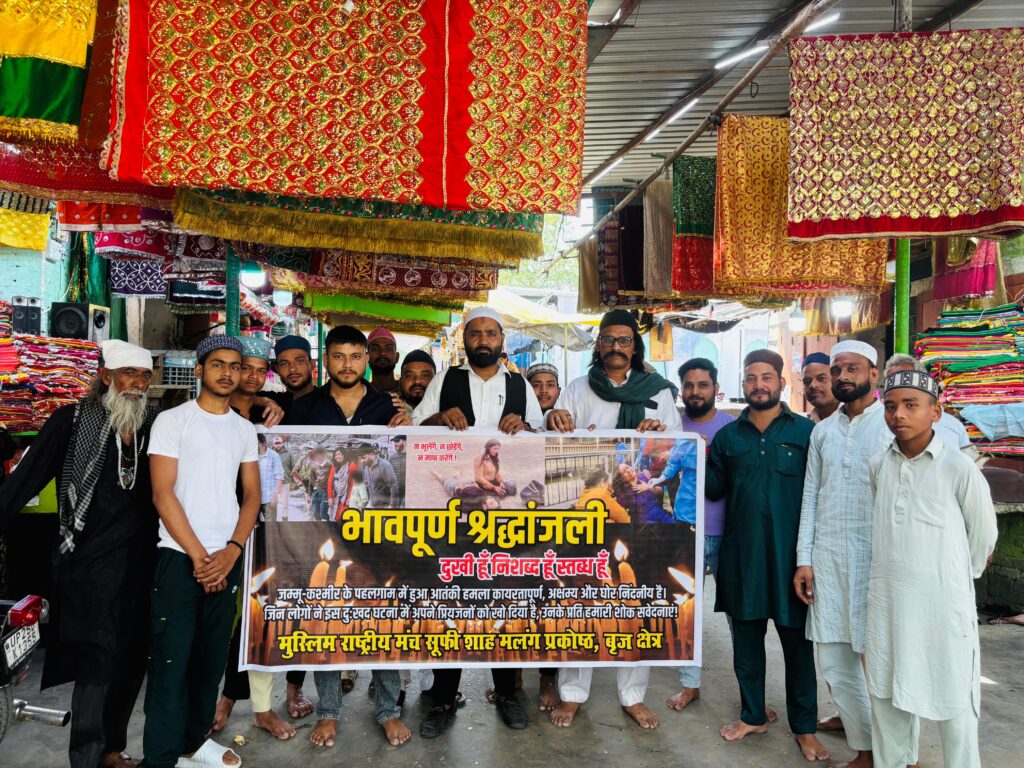 बदायूं। मुस्लिम राष्ट्रीय मंच सूफी शाह मलंग प्रकोष्ठ ब्रज क्षेत्र सयोंजक एडवोकेट मोहम्मद शीराज़ आलम के नेतृत्व में मुस्लिम समाज ने जुमे की नमाज़ के बाद दरगाह छोटे सरकार पर विरोध प्रदर्शन कर पाकिस्तान और आतंकवाद मुर्दाबाद के नारे लगाए। मोहम्मद शीराज़ आलम ने कहा कुरान में कहा गया है, जिसने एक बेकसूर का कत्ल किया, उसने पूरी इंसानियत का कत्ल कर दिया। वहीं, जिसने एक व्यक्ति की जान बचा ली, मानों उसने पूरी इंसानियत को बचा लिया।आतंकी हमला अत्यंत दु:खद, निंदनीय और मानवता के विरुद्ध एक कायरता पूर्ण कृत्य है।लश्कर-ए-तैयबा द्वारा किए गए इस हमले में निर्दोष लोगों की जान जाने से देश की जनता आक्रोशित है और पूरे देश में पाकिस्तान के खिलाफ विरोध प्रदर्शन हो रहे हैं।हम प्रधानमंत्री नरेंद्र मोदी से अपील करते है कि पाकिस्तान को इस कायराना हरकत का कड़ा जवाब दिया जाए। इस अवसर पर जिला सयोंजक अजमत मुशाहिद पीर पीर अन्नू पीर अकरम पीर अथर पीर शाहरुख नसीम पप्पू सैफी आदि उपस्थित रहे