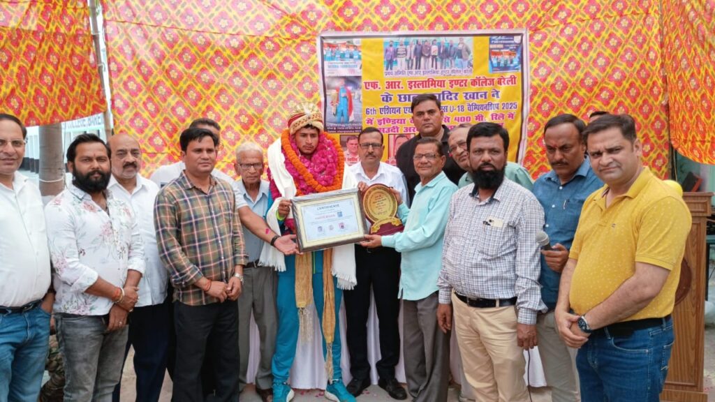 बरेली । 6 वी अंडर 18 चैंपियनशिप एशियन गेम प्रतियोगिता जो की दम्माम सऊदी अरब में संपन्न हुई जिसमें 400 मीटर रिले में रिकॉर्ड बनाते हुए सिल्वर मेडल जीतने पर विद्यालय एफ आर इस्लामिया इंटर कॉलेज बरेली ने अपने छात्र कादिर खान का भव्य स्वागत किया। छात्र के अभिनंदन हेतु एक कार्यक्रम का आयोजन किया जिसके अध्यक्ष प्रबंध समिति के अध्यक्ष नफीस अंसारी एडवोकेट रहे और प्रबंधक सैयद कमल अली साहब मुख्य अतिथि रहे एवं उप प्रबंधक हसीन हुसैन उपाध्यक्ष सरफराज अली खान चौधरी असलम मियां कोषाध्यक्ष शहजाद अहमद खान इस अफसर पर राजकीय इंटर कॉलेज के प्रधानाचार्य ओम प्रकाश राजभर विद्यालय के खेलकूद एवं अनुशासन अत्यधिक विद्यालय की तारीफ की और पदक विजेता छात्र को बहुत ही बधाई दी और इस्लामिया इंटर कॉलेज के प्रवक्ता शारीरिक शिक्षक कीड़ा प्रभारी शाहिद रज़ा ने कादिर खान को खेल वाले जूते शील्ड व सम्मान पत्र प्रदान किया प्रबंधक सैयद कमर अली एवं उपाध्यक्ष सरफराज वली खान नगद पुरस्कार भी दिया। कार्यक्रम में आने वाले जिला सचिव एथलेटिक्स गजेंद्र तोमर आदेश यादव व्यायाम शिक्षक गुरु गोविंद सिंह मीरा गंगवार रिकी सिंह इण्टर कॉलेज प्रणय कुमार राजकीय इंटर कॉलेज केपी सिंह भदोरिया प्रबंधक गैनी इंटर कॉलेज की उपस्थिति रही इस क्रम में विद्यालय के सभी शिक्षकों का भी विशेष योगदान रहा जिसमें टी एच खान मेजर मुशाहिद रज़ा खान शाहबाज राहिल खान कमाल मुस्तफा डॉक्टर इमरान आलम अशफाक अली सरफराज मुताहिर अली ने भी पदक विजेता का सम्मान किया विद्यालय के प्रधानाचार्य तौकीर सिद्दीकी ने सभी का आभार व्यक्त किया तथा कार्यक्रम का संचालन बृजेश कुमार शर्मा ने किया ।