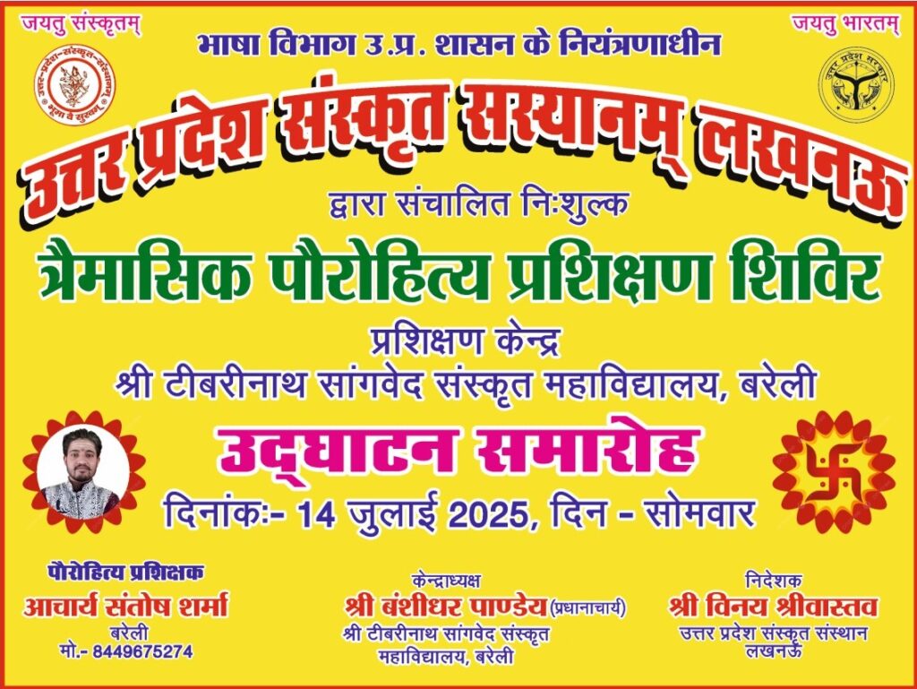 बरेली। उत्तर प्रदेश सरकार भाषा विभाग के नियन्त्रणाधीन उत्तर प्रदेश संस्कृत संस्थान लखनऊ द्वारा प्रदेश के सभी जिलों में पौरोहित्य प्रशिक्षण के प्रकल्प चलाए जा रहे हैं, बरेली के श्री टीबरीनाथ सांगवेद संस्कृत महाविद्यालय में पौरोहित्य प्रशिक्षण का उद्घाटन श्रावण मास प्रथम सोमवार को किया गया ।प्रथम उ.प्र.संस्कृत संस्थान के अधिकारियों द्वारा आनलाइन सामूहिक उद्घाटन किया गया ,उपरांत आफलाइन माध्यम से कार्यारम्भ किया गया । सर्वप्रथम महाविद्यालय के बालकों द्वारा वेद पाठ मंगलाचरण के माध्यम से प्रधानाचार्य बंशीधर पाण्डेय एवं मुख्य अतिथि सुरेश चंद्र शर्मा ने मां सरस्वती के समक्ष दीप प्रज्वलित कर माल्यार्पण किया, पौरोहित्य प्रशिक्षक आचार्य सन्तोष शर्मा द्वारा त्रैमासिक प्रशिक्षण के माध्यम से किस प्रकार हम पौरोहित्य का धार्मिक ,शास्त्रीय , व आधुनिक माहात्म्य को समझेंगे व सीखेंगे तथा इससे प्राप्त ज्ञान व लाभ के विषय में बताया , सुरेश शर्मा ने संस्कृत संस्कृति के लिए आवश्यक है तथा आज के समय में समाज को पौरोहित्य की आवश्यकता पर अपने विचार व्यक्त किए , आचार्य महेश शर्मा द्वारा समाज में हो रही विसंगतियों के सुधार के लिए पौरोहित्य क्यों आवश्यक है यह बताया ,आचार्य ओमपाठक ने संस्कारों की आवश्यकता पर अपने विचार प्रकट किए , प्रधानाचार्य बंशीधर ने उत्तर प्रदेश सरकार व संस्कृत संस्थान लखनऊ को धन्यवाद देते हुए बताया कि सरकार व संस्थान जनमानस के हित में कार्य कर रहे हैं , संस्कृत संस्थान का मुख्य उद्देश्य जन जन तक सही माध्यम से पौरोहित्य का ज्ञान प्रदान करना है, जिसमें सभी इसका लाभ प्राप्त करें और समाज में जागृति हो । इस अवसर पर अतुल कुमार शर्मा,कुमार प्रशांत , राजीव अवस्थी, विद्यार्थी व विद्यालय परिवार के सदस्य उपस्थित रहें कार्यक्रम का समापन शान्ति पाठ के द्वारा किया गया ।
