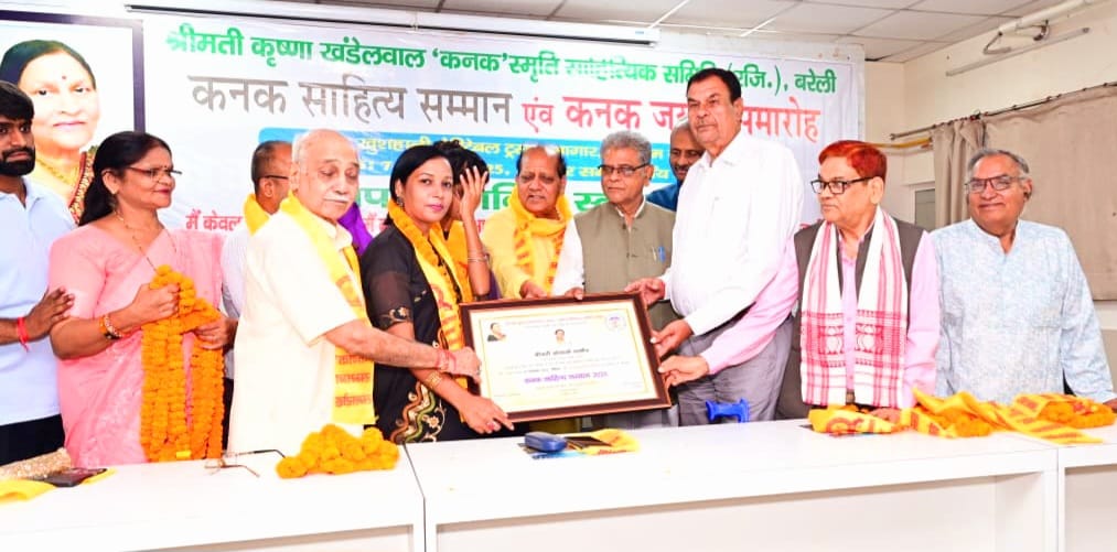 बरेली। श्रीमती कृष्णा खण्डेलवाल की स्मृति में “कनक” की जयंती के अवसर पर इस वर्ष भी कनक साहित्य सम्मान समारोह का भव्य आयोजन संस्थापक/अध्यक्ष वीरेन्द्र प्रसाद खंडेलवाल के नेतृत्व में खुशहाली ट्रस्ट के सभागार में किया गया। कार्यक्रम के मुख्य अतिथि वन मंत्री डा. अरुण कुमार एवं कैंट विधायक संजीव अग्रवाल द्वारा हाथरस से पधारी कवियित्री सोनाली वार्ष्णेय को कविता और साहित्य के क्षेत्र में अविस्मरणीय योगदान हेतु कनक साहित्य सम्मान प्रदान किया