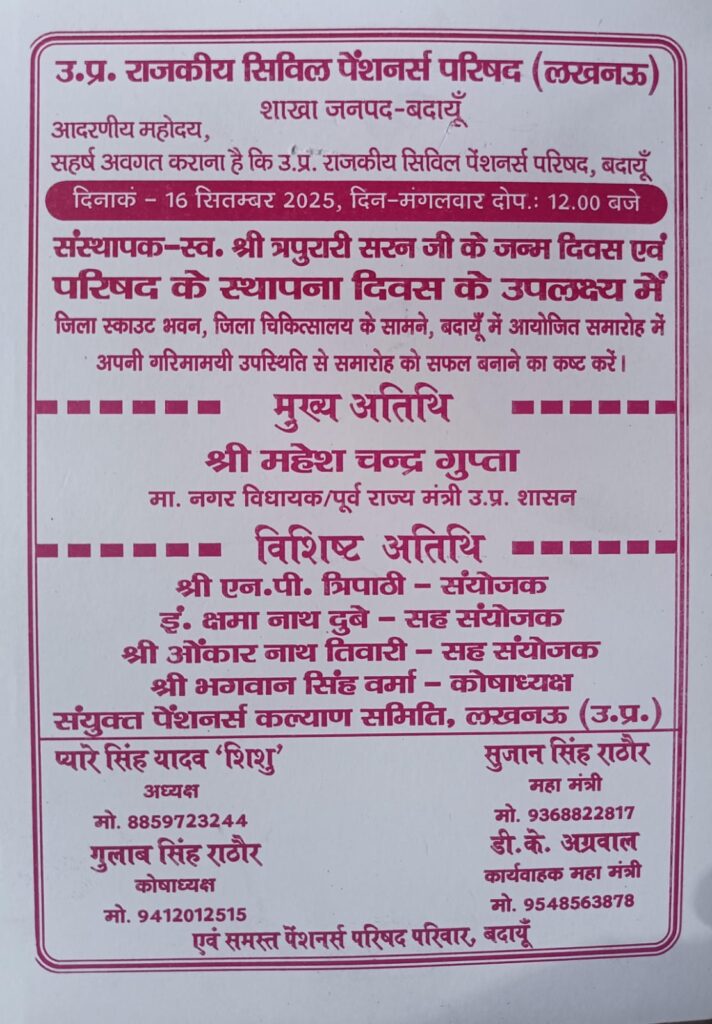 बदायूं। उ० प्र० राजकीय सिविल पेन्शनर्स परिषद के संस्थापक स्व० त्रिपुरारी सरन का जन्मोत्सव एवं परिषद का स्थापना दिवस समारोह 16 सितम्बर को दोपहर 12.00 बजे से स्काउट एवं गाइड भवन, निकट जिला चिकित्सालय पर आयोजित होगा जिसकी अध्यक्षता प्यारे सिंह यादव द्वारा की जायेगी तथा मुख्य अतिथि महेश चन्द्र गुप्ता, सदर विधायक एवं पूर्व राज्य मंत्री उ० प्र० सरकार एवं विशिष्ट अतिथि राजधानी लखनऊ से आने वाले संयुक्त पेन्शनर्स कल्याण समिति लखनऊ उ०प्र० के संयोजक एन. पी. त्रिपाठी, सह संयोजक ई० क्षमा नाथ दुबे, ओंकार नाथ तिवारी एवं कोषाध्यक्ष भगवान सिंह वर्मा के सानिध्य में उक्त समारोह सम्पन्न होगा। उक्त जानकारी परिषद के मीडिया प्रभारी डी० के० अग्रवाल द्वारा प्रदान की गई है।