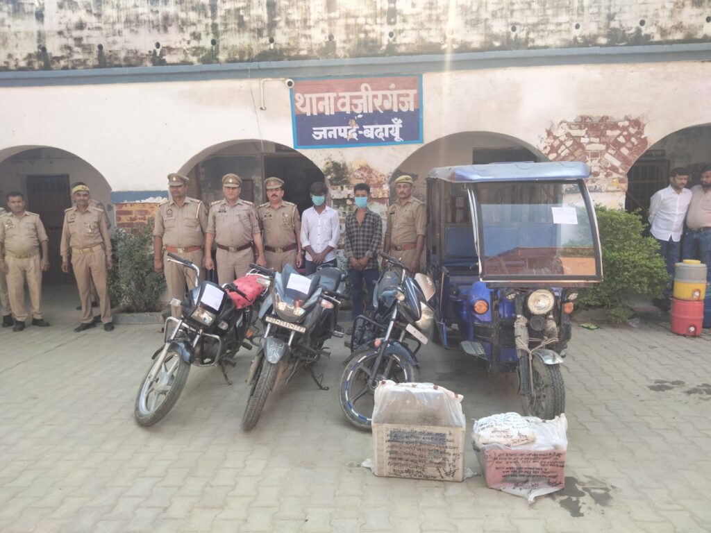 बदायूं। थाना वजीरगंज पुलिस ने वाहन चोरी की घटना का पर्दाफाश किया है। पुलिस ने आरोपी अभय पाठक औऱ अभिषेक पाठक निवासीगण ग्राम बैहटा पाठक थाना इस्लामनगर को चोरी की 03 बाइक,01 ई-रिक्शा, 01 इनवर्टर, 03 बैटरे व 12 घण्टियां बरामद की है। 12 सितम्बर को आवेदक बच्चन मियाँ निवासी मो0 खेड़ा वार्ड नं0 11 कस्बा सैदपुर थाना वजीरगंज ने थाने पर तहरीरी सूचना दी कि सैदपुर के जंगल में बने वादी के फार्म हाऊस से अभि0गण 1. अभिषेक पाठक औऱ अभय पाठक निवासीगण बेहटा पाठक थाना इस्लामनगर द्वारा एक बैटरा इन्वर्टर का व एक बैटरा वही खडे ट्रैक्टर चोरी हुआ है ।