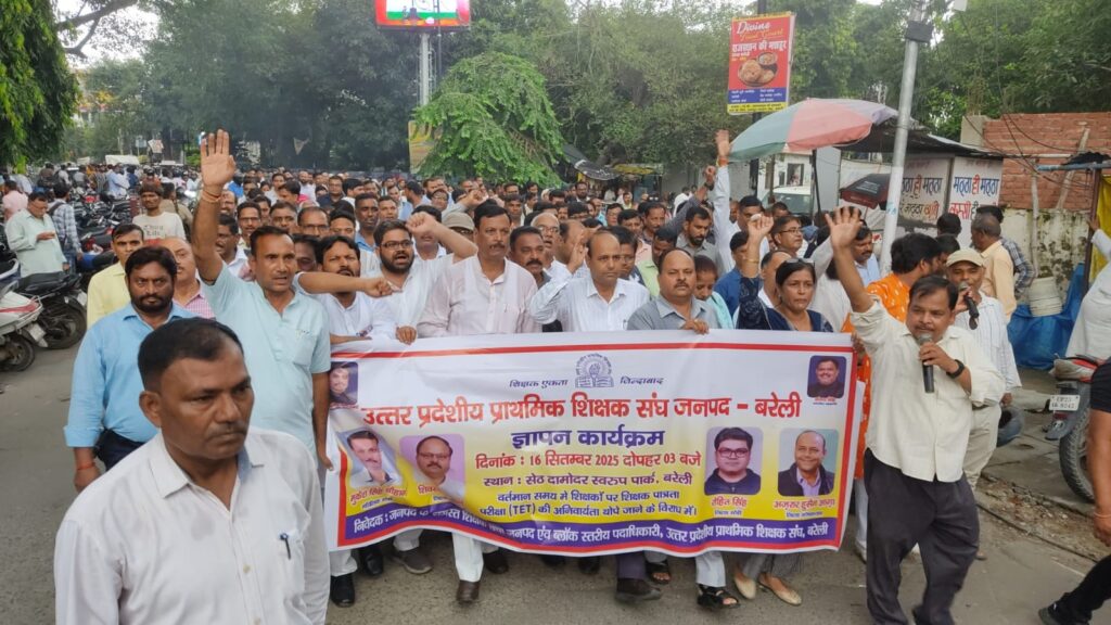 बरेली। उत्तर प्रदेशीय प्राथमिक शिक्षक संघ के जिला अध्यक्ष शिव स्वरूप शर्मा के नेतृत्व में शिक्षकों ने टीईटी के विरोध में प्रदर्शन किया जिला अधिकारी कार्यालय पर प्रधानमंत्री को संबोधित ज्ञापन एसीएम को दिया। टीईटी अनिवार्यता के विरोध को लेकर बरेली में उत्तर प्रदेशीय प्राथमिक शिक्षक संघ का विरोध प्रदर्शन लगातार जारी है। शिक्षकों का आरोप है कि उन्होंने अपने भर्ती की समय की सारी क्वालिफिकेशन सारी अहर्ता पूरी की है लेकिन अब उन पर टीईटी को जबरदस्ती थोपा जा रहा है । शिक्षकों का आरोप है कि सिविल सर्विसेज जैसे अधिकारियों पर कोई नई नियम कभी लागू नहीं किए जाते जबकि हर बार शिक्षकों पर ही नए नियम थोपकर उन्हें निशाना बनाया जाता है। शिक्षकों ने मुख्यमंत्री योगी आदित्यनाथ के पुनर्विचार याचिका दाखिल करवाने का स्वागत किया है । लेकिन मांग है कि टीईटी की बाध्यता से उन्हें मुक्त किया जाए। दरअसल सर्वोच्च न्यायालय के आदेश के बाद बेसिक शिक्षा विभाग के शिक्षकों की नींद उड़ गई है। जब से टीईटी को लेकर सर्वोच्च न्यायालय का आदेश हुआ है तब से बगैर टीईटी पास शिक्षकों में हड़कंप मचा हुआ है। और इन्हीं मांगों को लेकर पूरे प्रदेश में बेसिक शिक्षा महकमा के शिक्षक लगातार विरोध प्रदर्शन पर डटे हुए हैं हालांकि आज प्रदेश के मुख्यमंत्री योगी आदित्यनाथ ने बेसिक शिक्षा विभाग को पुनर्विचार याचिका दाखिल करने का आदेश दे दिया है लेकिन इसके बावजूद बरेली बेसिक शिक्षा विभाग के शिक्षक मानने को तैयार नहीं है । शिक्षकों की मांग है कि जो कानून बनाया गया है उस कानून को वापस ले लिया जाए और जिससे कि उन्हें टीईटी से मुक्ति मिल सकते। शिक्षकों का आरोप है कि हमेशा शिक्षकों को ही निशाना बनाया जाता है जबकि सिविल सर्विसेज सहित दूसरे अन्य विभागों पर कभी कोई नए नियम नहीं थोपे जाते लेकिन शिक्षक को कमजोर समझ कर उसके ऊपर ही हमेशा सारे नियम थोपे जा रहे हैं। प्रदर्शन करने बालों में जिला अध्यक्ष शिव स्वरूप शर्मा, रोहित सिंह , अजरार हुसैन आगा सहित सैकड़ों शिक्षक मौजूद थे।