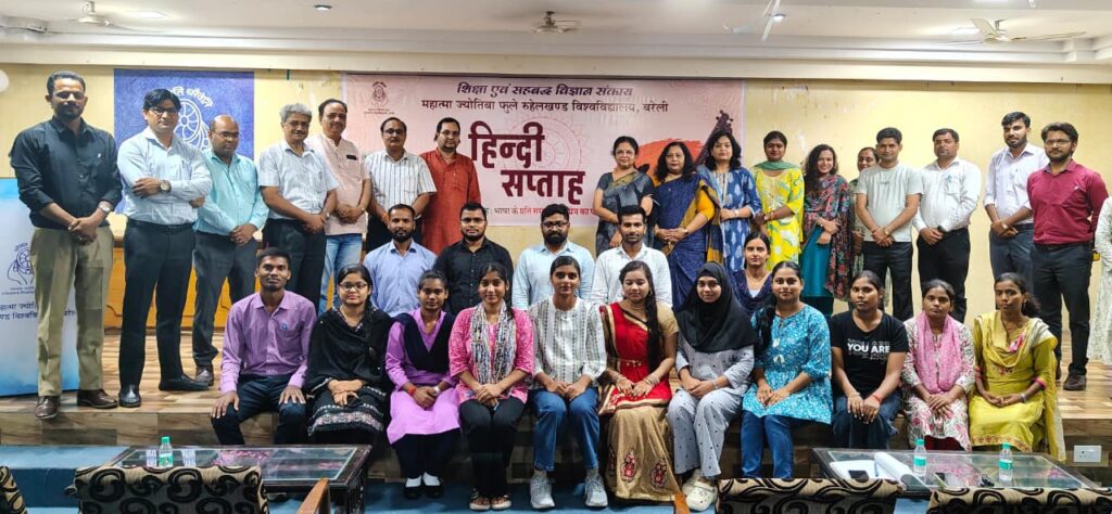 बरेली। महात्मा ज्योतिबा फूले रुहेलखंड विश्वविद्यालय के बी.एड./एम.एड. विभाग में “हिंदी सप्ताह : भाषा के प्रति सम्मान और प्रेम का पर्व” कार्यक्रम का आयोजन किया गया। कार्यक्रम का शुभारंभ विभागाध्यक्ष प्रो. संतोष अरोरा एवं विभाग के शिक्षकों द्वारा दीप प्रज्वलन से हुआ। संचालन विभाति अग्रवाल व प्रदीप कुमार ने किया। कार्यक्रम में बी.एड. द्वितीय वर्ष की छात्रा मीनू पांडे ने कवियों के दोहों के माध्यम से हिंदी की महत्ता पर प्रकाश डाला, जबकि श्रेय रस्तोगी ने अंकल वान्या नाटक का दृश्य प्रस्तुत किया। प्रिंसी ने “हमारी जान है हिंदी, हमारी शान है हिंदी” पंक्तियों से हिंदी का महत्व व्यक्त किया। श्रुति वर्मा ने “बुद्धिजीवी हिंदी की गति बढ़ाएं, पर लड़कन को कॉन्वेंट में पढ़ाएं” जैसी पंक्तियों से अपने विचार साझा किए। एम.एड. द्वितीय वर्ष के छात्र उत्पल कुमार ने राम सेतु संवाद प्रस्तुत किया, वहीं बी.एड. प्रथम वर्ष के छात्र सुधांशु गंगवार।