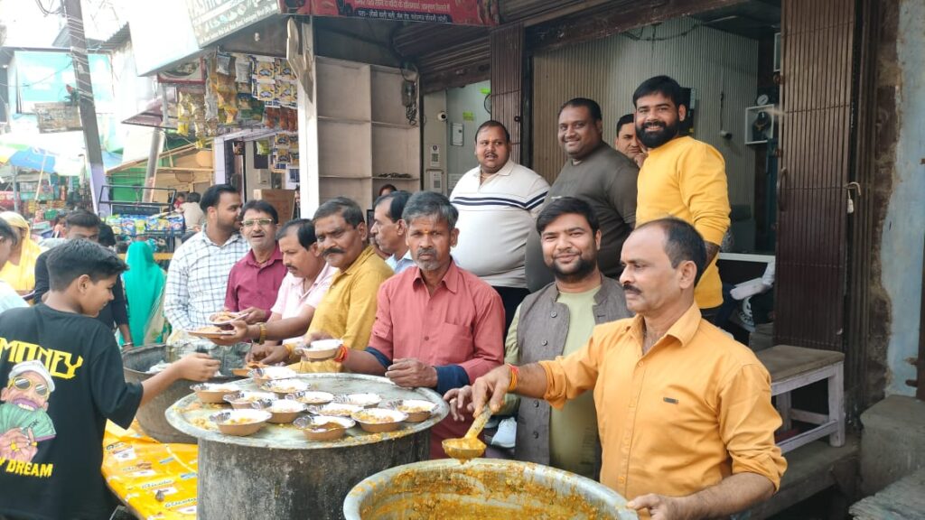 बरेली। फतेहगंज पश्चिमी कस्बे की मेन बाजार में सीखों वाली गली के पास शुभम ज्वेलर्स की दुकान के सामने बाबा महाकाल के भक्तों ने विशाल भंडारा कराया। जानकारी के अनुसार कस्बे के प्रमुख समाजसेवी सर्राफा व्यापारी शुभम अग्रवाल व प्रशांत अग्रवाल ने बताया कि कस्बे के प्रमुख समाजसेवी एवं 12 ज्योतिर्लिंगों के दर्शन करने वाले और हर साल 300 लोगों का जत्था लेकर महाकाल के दर्शन करने वाले महंत सत्य प्रकाश अग्रवाल की आज 3 नवंबर दिन सोमवार को उनकी प्रथम पुण्यतिथि पर दूर दराज से आए महाकाल के भक्तों एवं प्रमुख समाजसेवियों व राजनीतिक लोगों और कस्बे के व्यापारियों एवं कस्बा वासियों ने महंत सत्य प्रकाश अग्रवाल के चित्र पर फूल माला पहनाकर पुष्प अर्पित कर नमन किया और उन्हें श्रद्धांजलि दी। और उनके बताए रास्ते पर चलने की बात कही। उसके बाद कस्बे की मेन बाजार में विशाल भंडारा कराया गया। भंडारे में दूर दराज से बरेली चौबारी गंगा दशहरा मेले में जा रहे श्रद्धालुओं एवं आसपास ग्रामीण क्षेत्र से साप्ताहिक बाजार खरीदारी करने आए लोगों और राहगीरों एवं कस्बा वासियों ने पूड़ी, कचौड़ी, सब्जी, मेवाओं से बनी खीर का आनंद लिया। इस मौके पर व्यापार मंडल अध्यक्ष आशीष अग्रवाल, मीरगंज विधायक डॉक्टर डीसी वर्मा, व्यापारी शशांक अग्रवाल उर्फ अन्ना भाई, हिमांशु अग्रवाल, सुबोध पोरवाल, सूचित अग्रवाल, मयंक अग्रवाल, डॉक्टर मुदित प्रताप सिंह, वरिष्ठ कॉन्टैक्टर जगत सिंह उर्फ सनी, सर्राफा व्यापारी नरेश ऐरन, विनोद अग्रवाल, कैलाश अग्रवाल, दीनानाथ, मुकेश भारद्वाज, डॉक्टर हरदेव गंगवार, संजीव अग्रवाल, रमेश भारद्वाज, विधायक प्रतिनिधि संजय चौहान, ठेकेदार गौरव मिश्रा, राज कपूर गुप्ता, अखिलेश अग्रवाल, अमित कुमार सिंह, श्याम सुंदर गुप्ता, दीपक गोयल, कमल गुप्ता, शशांक गुप्ता उर्फ मोनू, सुनील रस्तोगी, अंशुल अग्रवाल, पप्पू पान वाले, अमित गोयल, सतीश गुप्ता, राहुल गुप्ता, प्रेम प्रकाश गर्ग, बबलू सैनी, राजकुमार कश्यप, सुनील पांडे, रामकुमार, सर्राफा व्यापारी शुभम अग्रवाल, अन्ना भाई, प्रशांत अग्रवाल आदि लोगों श्रद्धांजलि एवं भंडारा कार्यक्रम में समिल रहे।