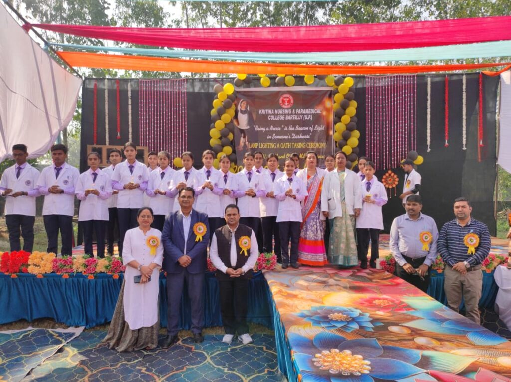 बरेली । कृतिका नर्सिंग कालेज, खाई खेड़ा पीलीभीत रोड रिठौरा, बरेली में बीएससी नर्सिंग, एएनएम, एवं ओटी एण्ड डीएमएलटी के छात्र-छात्राओं द्वारा सत्र 2025-26 में प्रवेशित नर्सिंग एवं पैरामेडिकल के छात्र-छात्राओं का शपथ ग्रहण सामारोह एवं फ्रैशर पार्टी का आयोजन किया गया। इस अवसर मुख्य अतिथि डा आशुतोष गंगवार ब्लॉक प्रतिनिधि, माया हॉस्पिटल नबावगंज, बरेली एवं कालेज चेयरमैन डा केपी गंगवार के साथ-साथ नर्सिंग प्राचार्य प्रोफेसर जिन्सी एम वार्गीज एवं पैरामेडिकल प्राचार्य डा स्मृति गंगवार द्वारा माँ सरस्वती के समक्ष दीप प्रज्जवलित कर कार्यक्रम का शुभारंभ किया गया। जिसके उपरान्त मुख्य अतिथि डा आशुतोष गंगवार एवं कालेज चेयरमैन डा केपी गंगवार ने नव प्रवेशित छात्र-छात्राओं का स्वागत किया एवं नर्सिंग के कर्तव्यो हेतु शपथ दिलाई इसके साथ-साथ उनके उज्जवल भविष्य के बारे में अपने विचार व्यक्त किये। उन्होंने कहा कि नर्सिंग एक ऐसा प्रोफेशन है जिसको करने के बाद आप भविष्य में बेरोजगार नहीं रह सकते हैं और आगे चल कर मानव जाति की सेवा करने का मौका उन्हें मिलता रहेगा।