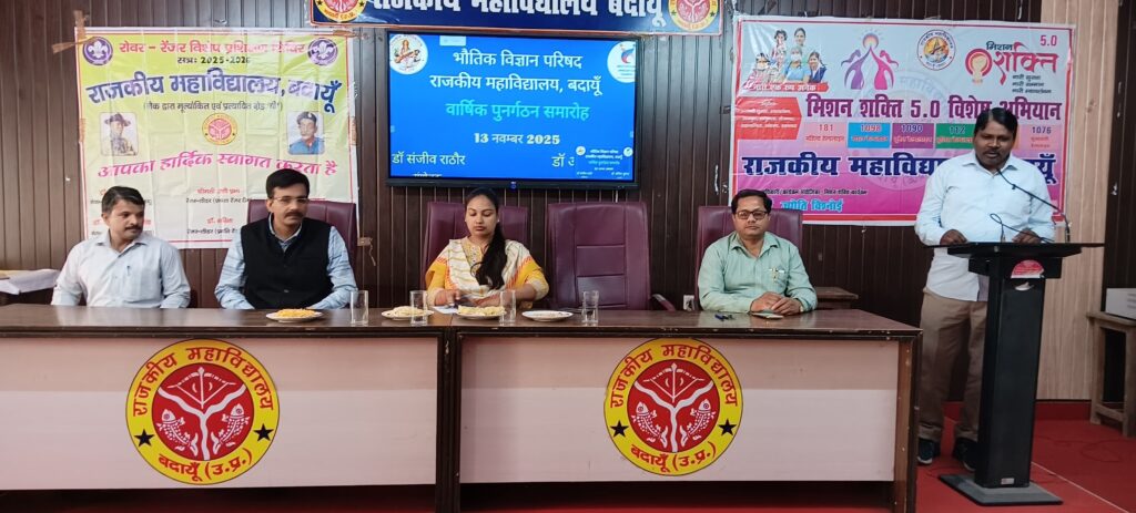 बदायूं।राष्ट्रीय शिक्षा नीति 2020 के सफल क्रियान्वयन एवं नवाचार को प्रोत्साहन देने हेतु राजकीय महाविद्यालय बदायूं में सत्र 2025-26 के लिए भौतिक विज्ञान परिषद का गठन किया गया। कार्यक्रम की अध्यक्षता प्रभारी प्राचार्य डॉ. अनिल कुमार ने की। अध्यक्ष पद पर अभिनव राठौर, महामंत्री पद पर अरविंद, उपाध्यक्ष पद पर सिया मिश्रा व अरुण सिंह, मंत्री पद पर ज्ञान सिंह तथा सहमंत्री पद पर अवनीश यादव और रंजीत कुमार का चयन किया गया। प्रयोगशाला मंत्री के रूप में दीक्षा शर्मा, सबिया बी और अंकित कुमार चुने गए। कार्यक्रम में हिंदी विभागाध्यक्ष डॉ. रविंद्र सिंह यादव, शारीरिक शिक्षा विभागाध्यक्ष डॉ. हुकुम सिंह तथा वनस्पति विज्ञान विभागाध्यक्ष डॉ. सरिता यादव ने पदाधिकारियों को शुभकामनाएं दीं और छात्रों से स्वाध्याय, अनुसंधान व तकनीकी नवाचार के माध्यम से अपने कौशल के विकास का आह्वान किया।प्रभारी प्राचार्य डॉ. अनिल कुमार ने कहा कि परिषद के माध्यम से छात्र अपने अध्ययन, प्रयोगशाला कार्य और अनुसंधान गतिविधियों में सक्रिय भागीदारी करके राष्ट्रीय शिक्षा नीति के उद्देश्यों को पूर्ण करेंगे। कार्यक्रम का संचालन परिषद के संयोजक डॉ. संजीव राठौर ने किया।