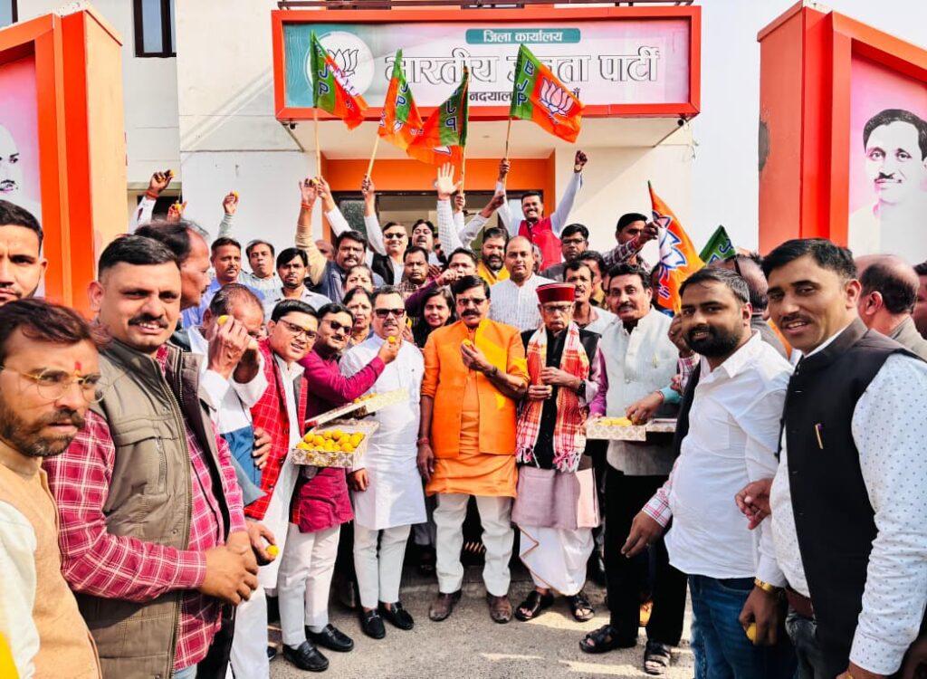 बदायूँ । भाजपा कार्यालय पर बिहार में पुनः एन.डी.ए. सरकार बनने की घोषणा के बाद जिले में भाजपा कार्यकर्ताओं में उत्साह की लहर दौड़ गई। जिलाध्यक्ष राजीव कुमार गुप्ता, सदर विधायक महेश चंद्र गुप्ता एवं पूर्व विधायक प्रेमस्वरूप पाठक ने पदाधिकारी व कार्यकर्ताओं के साथ एक-दूसरे को मिठाई खिलाकर, ढोल–नगाड़े और आतिशबाज़ी के साथ विजय उत्सव मनाया। जिलाध्यक्ष राजीव कुमार गुप्ता ने कहा कि बिहार में पुनः एन.डी.ए. सरकार का बनना जनता के विश्वास की जीत है। यह परिणाम कार्यकर्ताओं के समर्पण, संगठन की मजबूती और प्रधानमंत्री नरेंद्र मोदी की विकास नीति में जनता के भरोसे का प्रमाण है। उन्होंने कहा कि 2027 में भी इसी विजय यात्रा को जारी रखने का संकल्प हम सबने दोहराया है। सदर विधायक महेश चंद्र गुप्ता ने कहा कि यह जनादेश बिहार की जनता की उस सोच को दर्शाता है, जो स्थिर सरकार, सुशासन और विकास के पक्ष में खड़ी है। एन.डी.ए. की वापसी से बिहार में जनकल्याण योजनाओं को और अधिक गति मिलेगी। इस अवसर पर पूर्व विधायक प्रेमस्वरूप पाठक,पूर्व चैयरमैन दीपमाला गोयल, सुधीर श्रीवास्तव, एमपी सिंह राजपूत, शरदेन्दु पाठक, बीएस मौर्य, शैलेन्द्र मोहन शर्मा, विश्वजीत गुप्ता, केशव चौहान, रितेश चौहान, गोपाल शर्मा, राजीव शर्मा, ललतेश ठाकुर, गुलशन प्रताप सिंह, अजय मथुरिया, विजय शर्मा, सीमा राठौर, जोगेंद्र सिंह पटेल, उदयवीर दिवाकर, मुनीश अग्रवाल, वीरेश कुमार, रचित साहू पदाधिकारी, कार्यकर्ता एवं समर्थक बड़ी संख्या में मौजूद रहे।