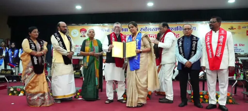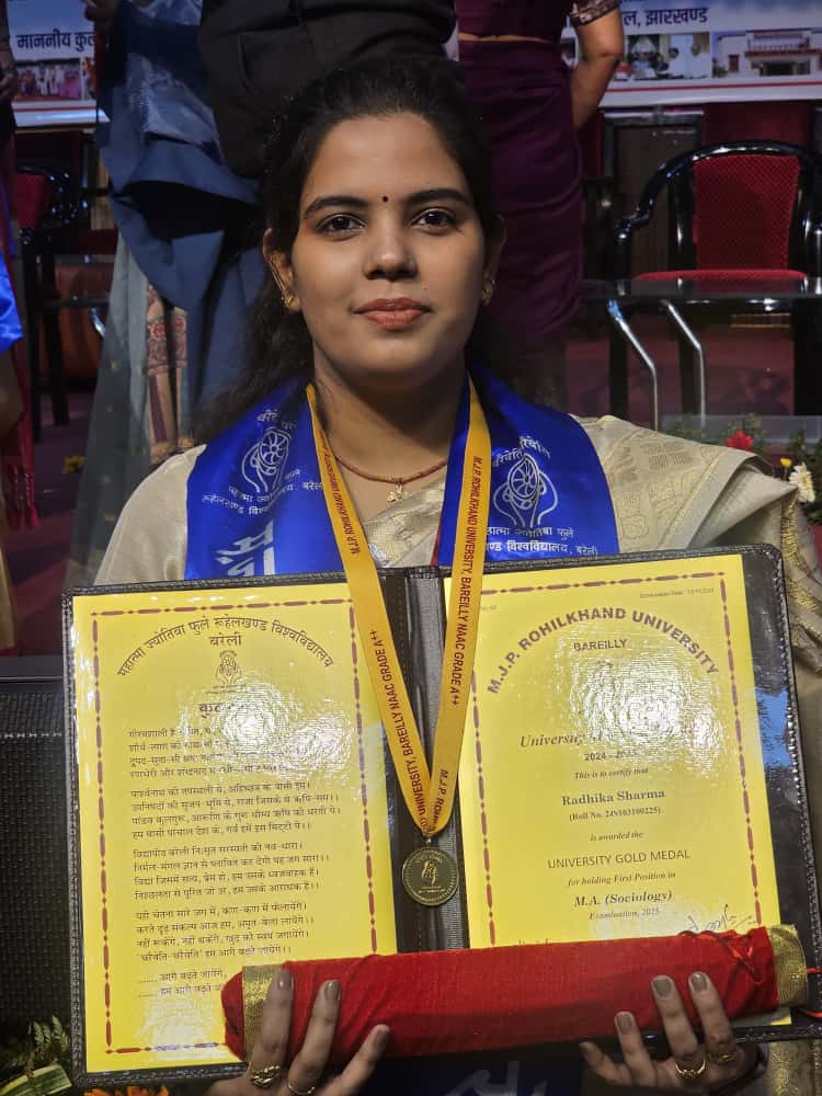 बदायूं। एमजेपी रुहेलखंड विश्वविद्यालय के अटल सभागार मे हुए समारोह में बदायूँ की राधिका शर्मा को एम.ए. समाजशास्त्र में पूरे विश्वविद्यालय में सर्वोच्च अंक प्राप्त करने करने पर, उत्तर प्रदेश की राज्यपाल आनंदीबेन पटेल और झारखंड के राज्यपाल संतोष गंगवार ने स्वर्ण पदक प्रदान कर सम्मानित किया गया.